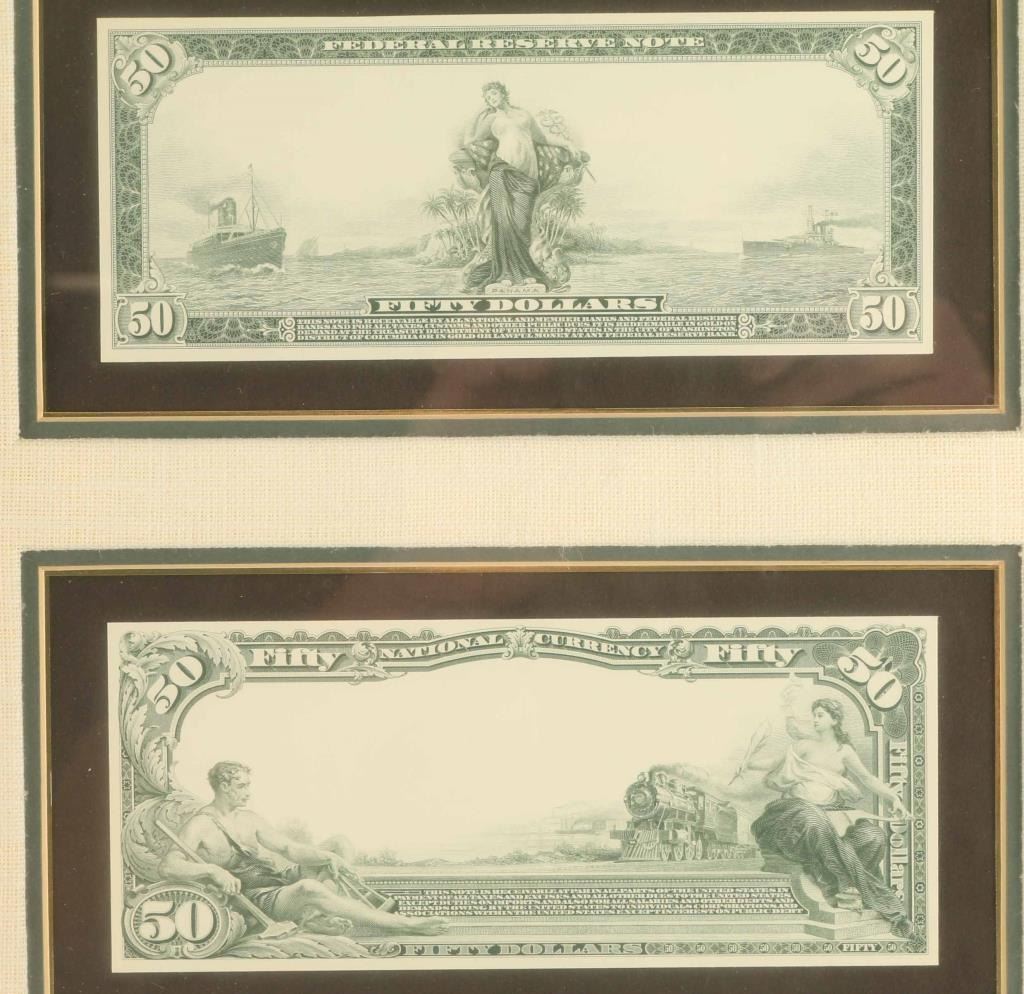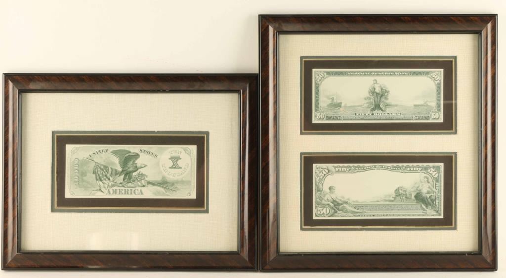 Includes (1) Framed back side of the $10,000 from the 1878 Series given away as a way to commemorate the International Paper Money Show from 1985, comes with documentation. Lot also includes (1) framed set of the front and back of a $50 US Note. Largest frame in this lot measures 13" by 14 1/2".