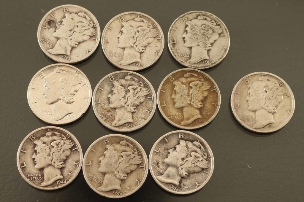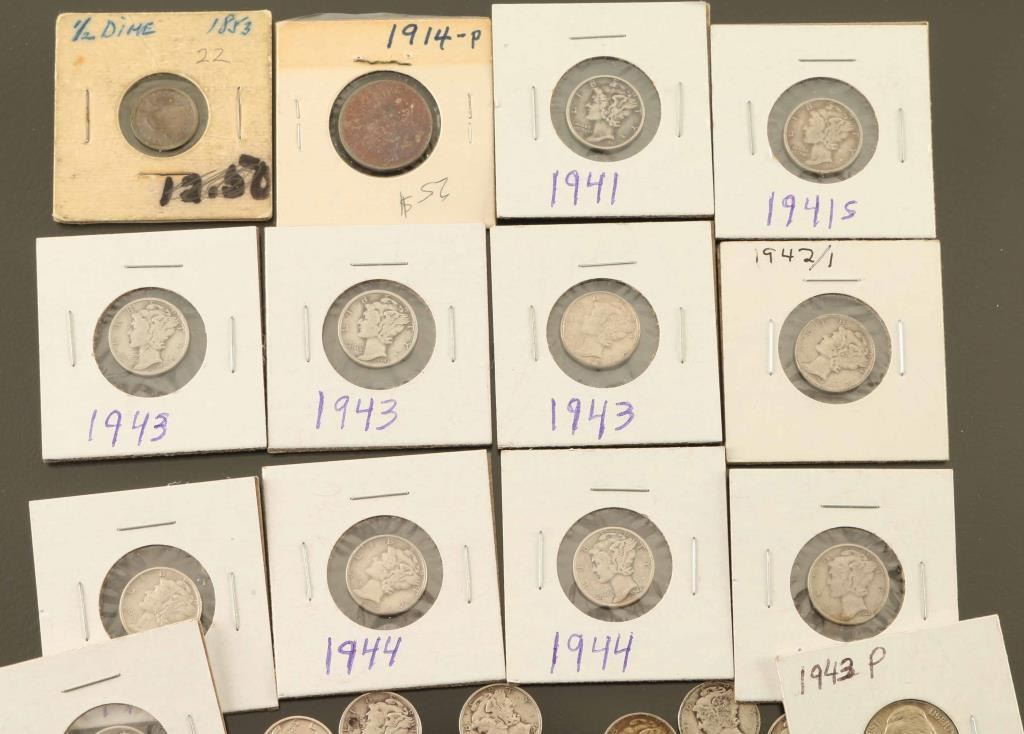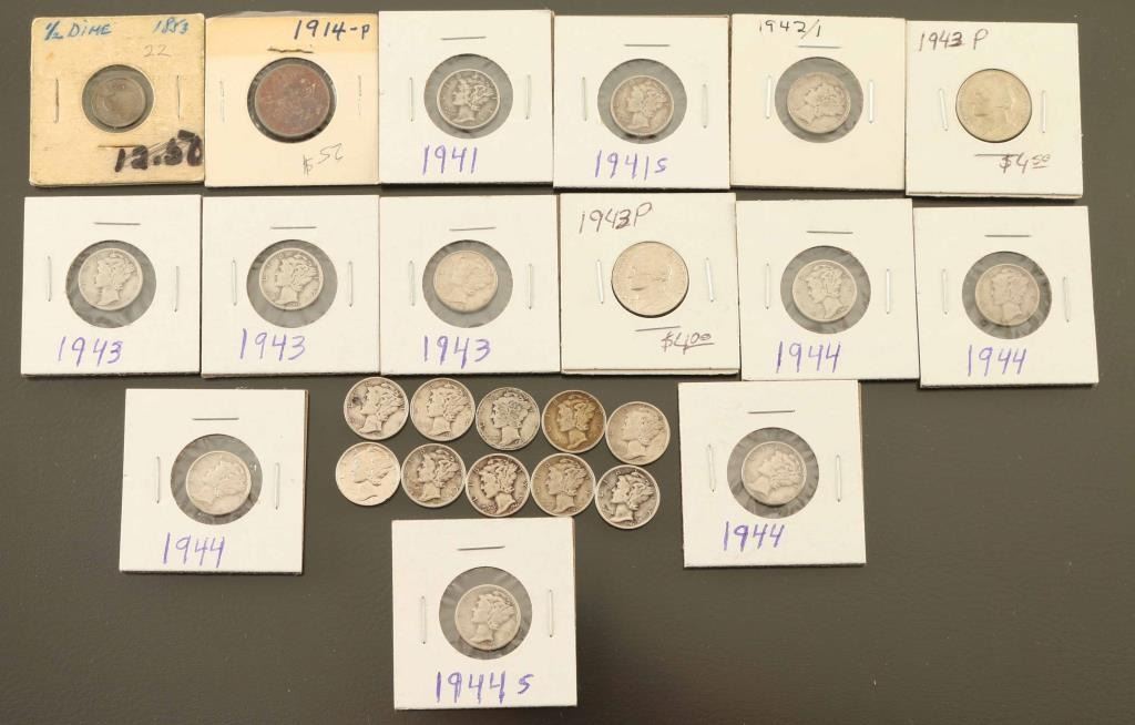 Lot includes 25 US issue coins, including 21 silver dimes, 2 "war silver" nickels. Most date to 1941 thru 1944, older coins include an 1853 "half dime" and 1914 P Nickel. Mix of loose and sealed in flips.