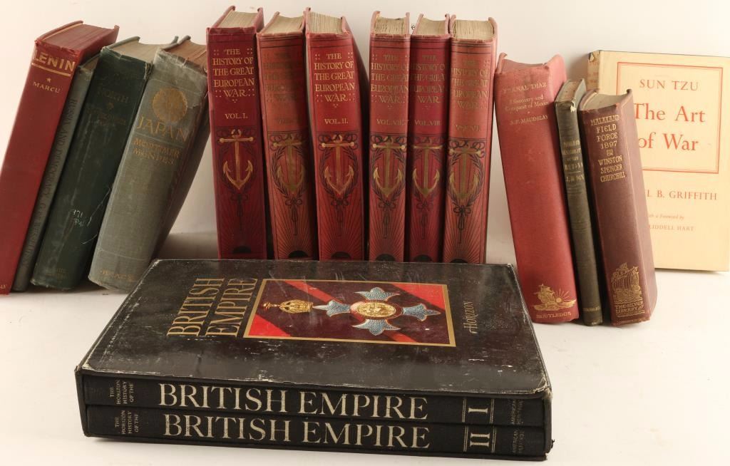 Including; "The Horizon History of British Empire, I & II", "Russia and Democracy" by G. De Wesselitsky, "Marches of the North" by E. Alexander Powell, "Japan A Record in Colour" by Mortimer Menpes, "Sun Tzu The Art of War", "The History of The Great European War" by W. Stanley Macbean Knight-six volumes, and many more!