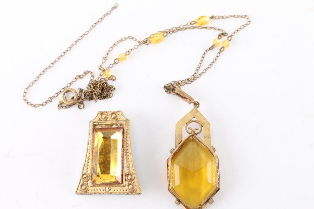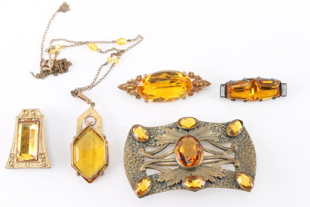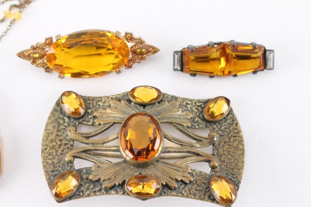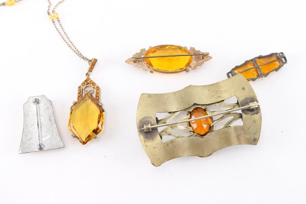 3 vintage yellow glass pins and one necklace with large center stone. Chain is broken.