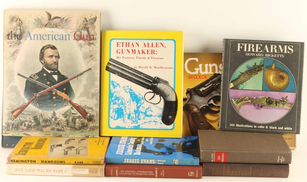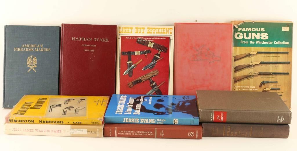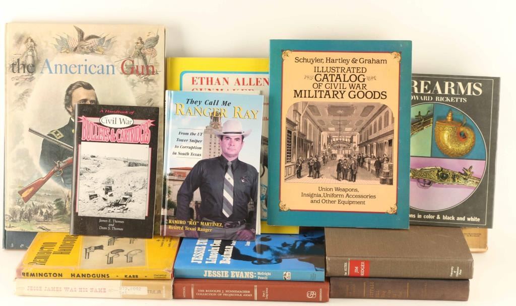 Includes a First Edition signed copy of "They Call Me Ranger Ray" by Ramiro "Ray" Martinez and is signed with a note on the first page, "Jesse James Was His Name" by William A. Settle Jr, "Nathan Starr Arms Maker" by Major James E. Hicks, "Jim Bridger" by J. Cecil Alter, "Buffalo Bill: King of the Old West" by Elizabeth Jane Leonard and Julia Cody Goodman, "Remmington Handguns" by Charles Lee Karr Jr. and Carroll Robbins Karr, "American Firearms Makers" by A. Merwyn Carey, "Famous Guns From the Winchester Collection" by Hank Wieand Bowman, "Early Percussion Firearms" by Lewis Winant, "The Rudolph J. Nunnemacher Collection of Projectile Arms Part 1 Long Arms" by John Metschl, and (6) more books.