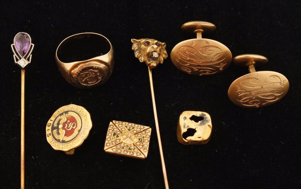 2 Hat pins on 14KT gold with purple stone, appears to be an amethyst and one other has a lion head with a single moissanite stone in his mouth, 10KT yellow gold cuff links with monogram design, Gold tooth filling, 14KT yellow Gold Class ring from PA, 14KT yellow gold and enamel pin from Southern High School1915,14KT yellow Gold Iron cross pin 1922 "UP".