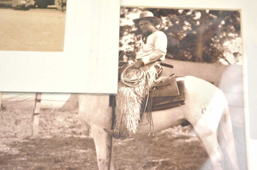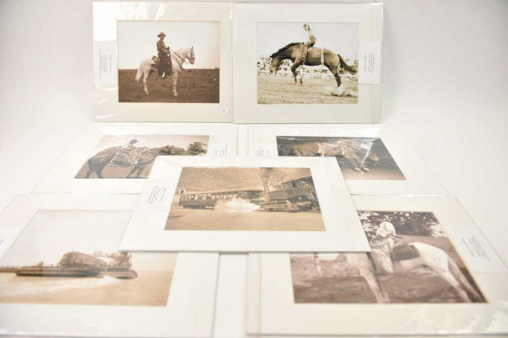 Lot of beautiful matted black and white photographs of cowboys and western scenes including; 101 Ranch Owner Zack Miller on Champion Horse circa 1916, Bareback Rider circa 1949 and Trick Roper in Wooly Chapscirca 1916, among others by A.M. Hartung. The photos measure 9 ½” x 7 ½” photo only and are matted with white card stock. A great group for the Cowboy/Western collector. $150-$300.