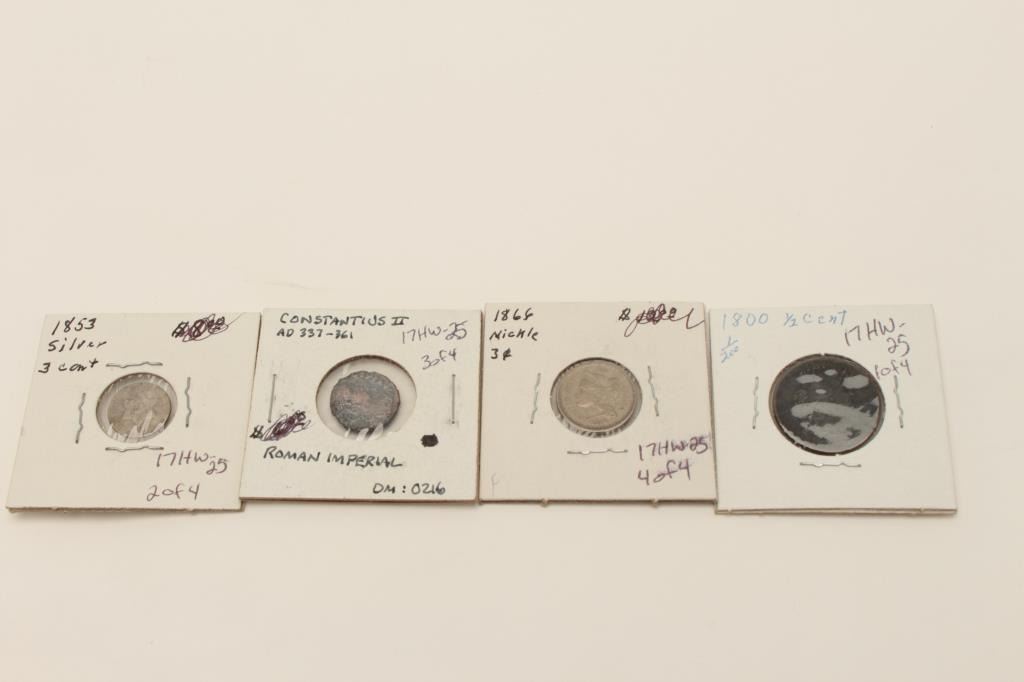 Lot of coins as described: 1853 3 cent U.S., Roman imperial 337 A.D.-361 A.D., 1866 nickel, 1800 half cent. Est.: $80-$160
