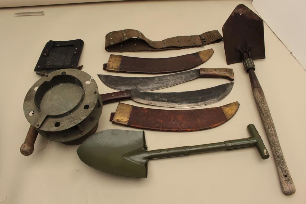 with leather scabbards, a military burner, 3 trench shovels and a web belt. Est.: $200-$400.