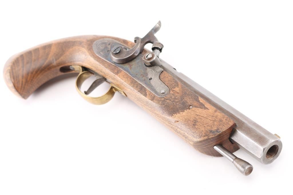1) SN: 131843. Spanish made percussion pistol chambered in .45. Features a blued finish, 6" octagonal barrel, blade front sight, missing rear sight, steel ram rod, engraved case color lock, smooth trigger, brass furniture and one-piece wood stock with bird's head grip. barrel exhibits an aged patina with some light scattered surface rust. Action performs well, rifled bore appears very good, dirty and wood stock is very good. NRA Condition-Good-Missing Sight, Antique Firearm 2) NVSN, CMC black powder replica pepper box pistol 4 barrel, 36 Cal, modern made. Functions great, you have to charge the bar hammer by lifting it slightly after firing, and turn the barrels manually. 3 1/4" barrel , bores look very good, dirty, the blued barrels are turning a brown patina from handling. NRA Condition-Very Good. Antique Firearm.