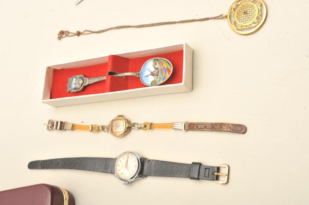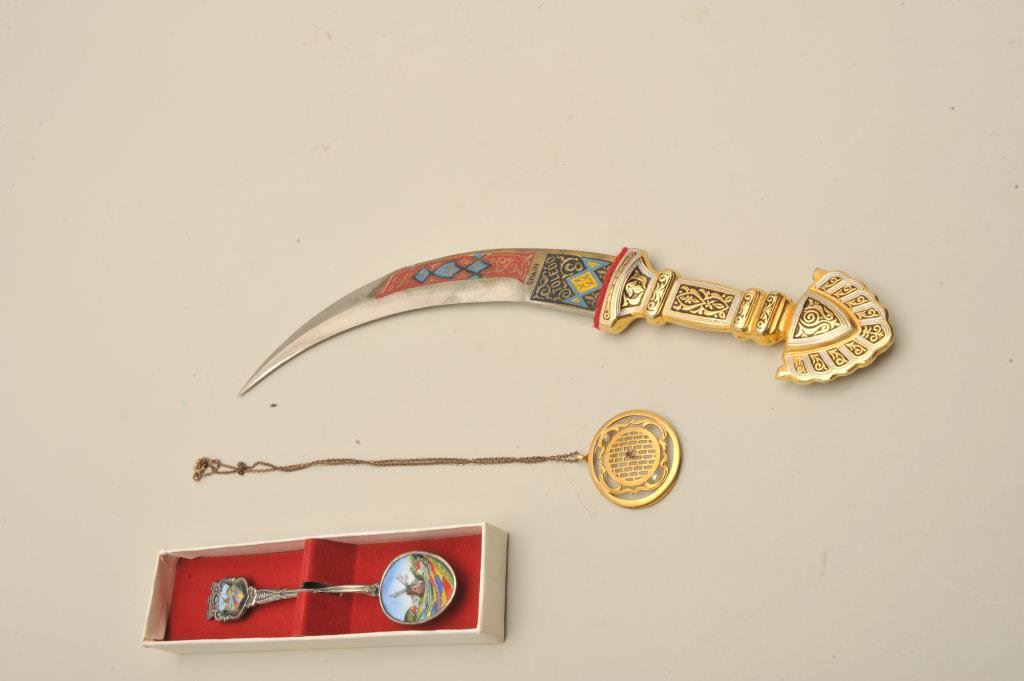 Swiss watch, Pikes Peak masonic souvenir trowel, plated pendant Toledo letter opener, and 1950s Holland marked enamel spoon. Est.: $75-150
