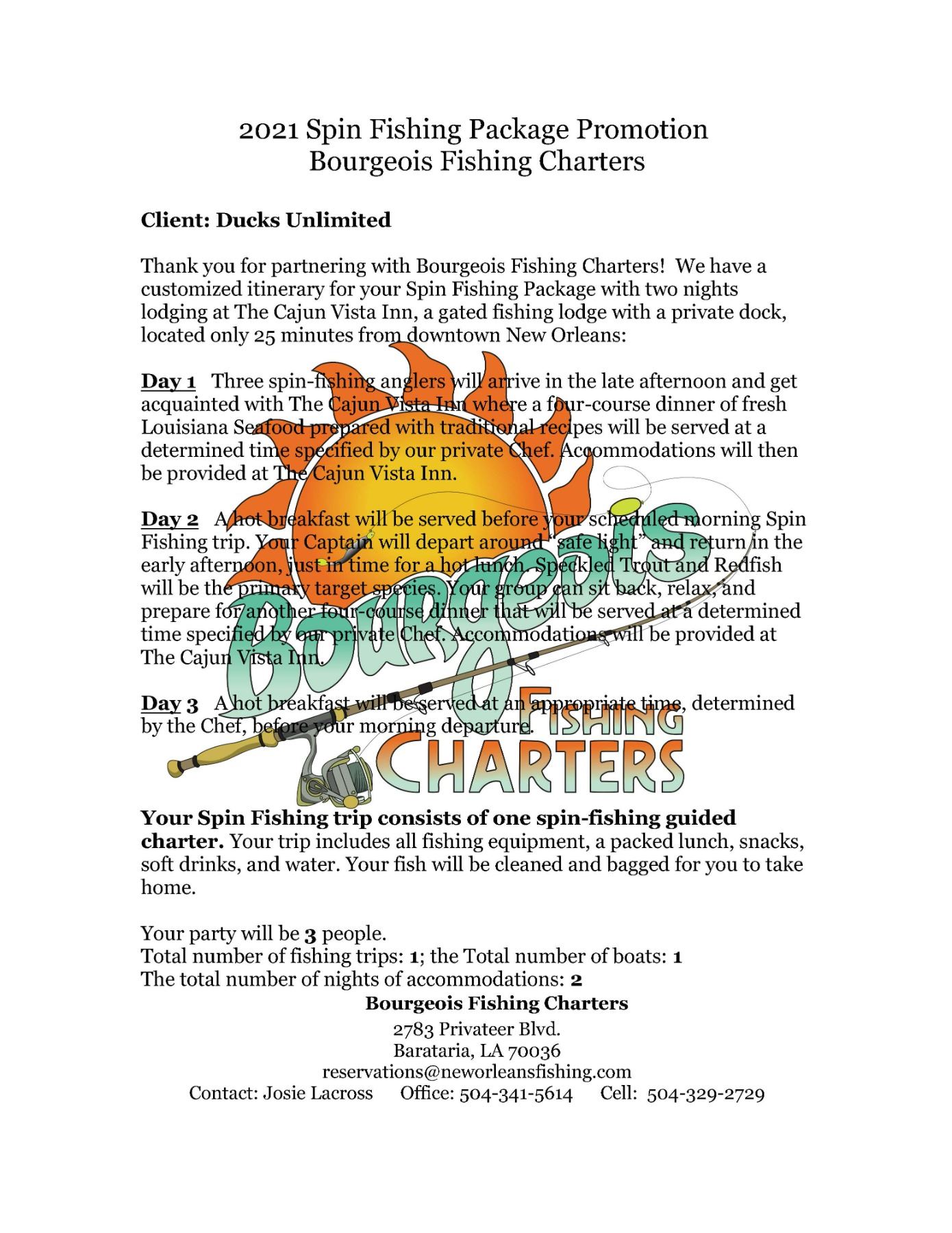 We have a customized itinerary for your Spin Fishing Package with two nights lodging at The Cajun Vista Inn, a gated fishing lodge with a private dock, located only 25 minutes from downtown New Orleans: Day 1 Three spin-fishing anglers will arrive in the late afternoon and get acquainted with The Cajun Vista Inn where a four-course dinner of fresh Louisiana Seafood prepared with traditional recipes will be served at a determined time specified by our private Chef. Accommodations will then be provided at The Cajun Vista Inn. Day 2 A hot breakfast will be served before your scheduled morning Spin Fishing trip. Your Captain will depart around “safe light” and return in the early afternoon, just in time for a hot lunch. Speckled Trout and Redfish will be the primary target species. Your group can sit back, relax, and prepare for another four-course dinner that will be served at a determined time specified by our private Chef. Accommodations will be provided at The Cajun Vista Inn. Day 3 A hot breakfast will be served at an appropriate time, determined by the Chef, before your morning departure. Your Spin Fishing trip consists of one spin-fishing guided charter. Your trip includes all fishing equipment, a packed lunch, snacks, soft drinks, and water. Your fish will be cleaned and bagged for you to take home. Your party will be 3 people. Total number of fishing trips: 1; the Total number of boats: 1, The total number of nights of accommodations: 2