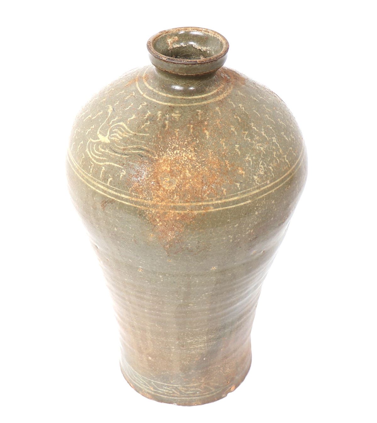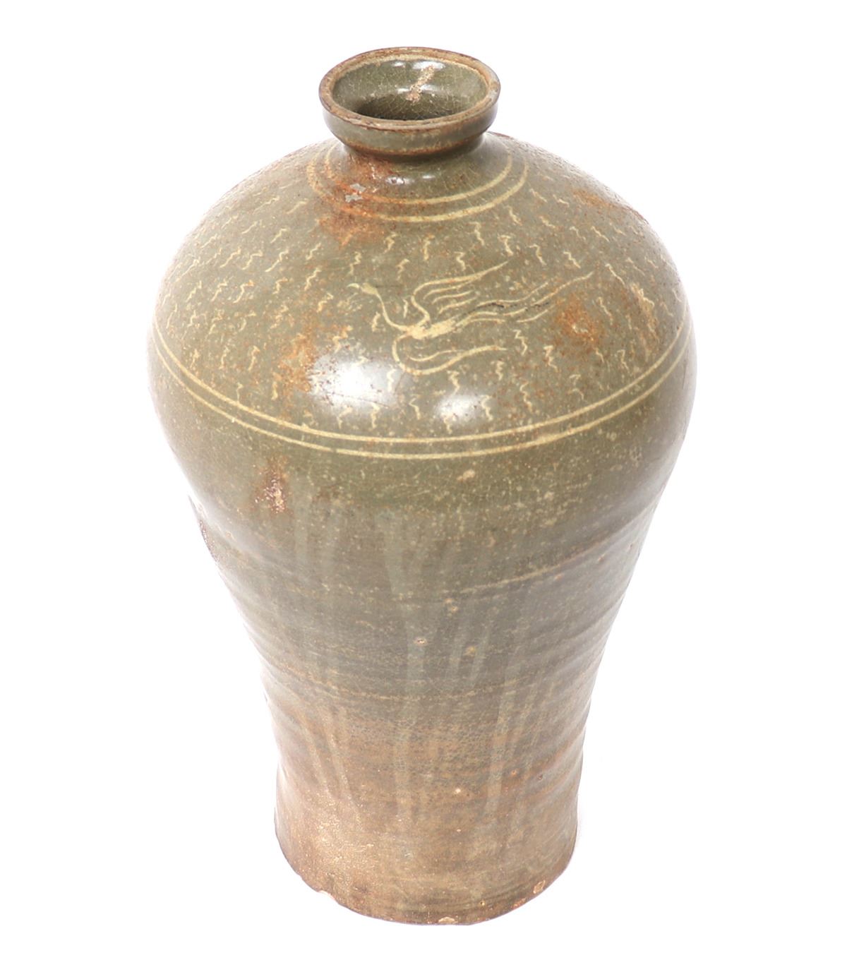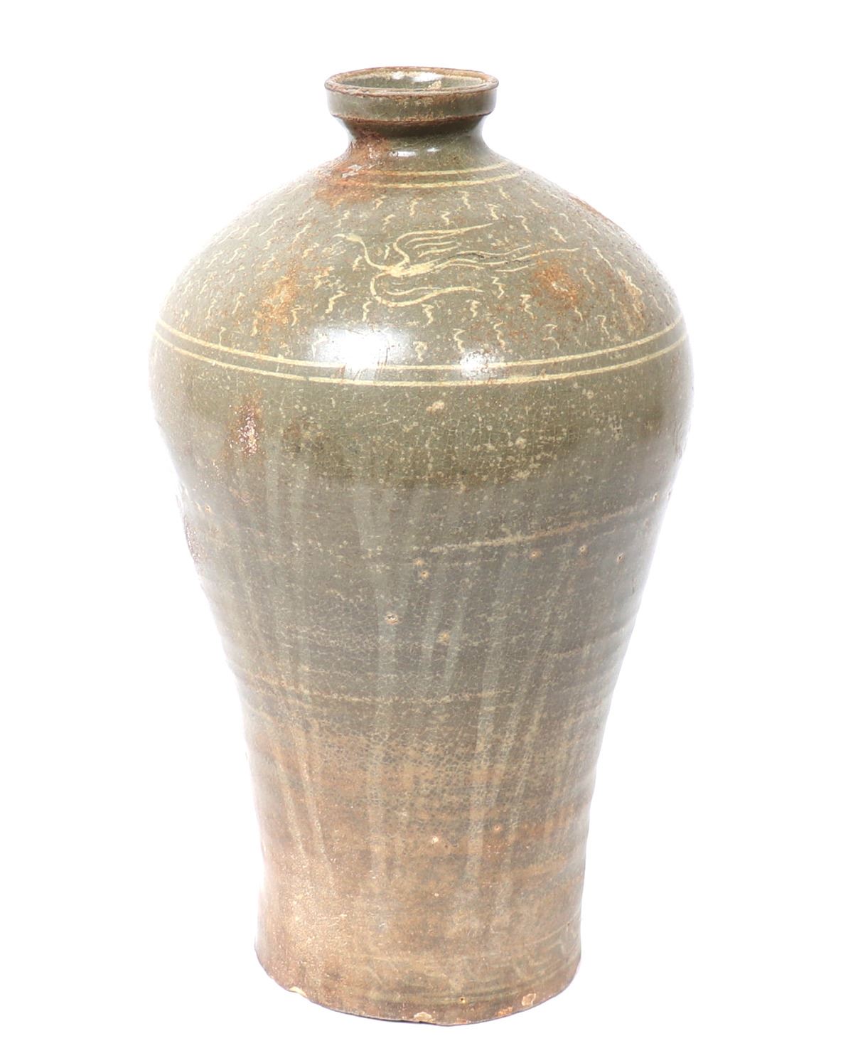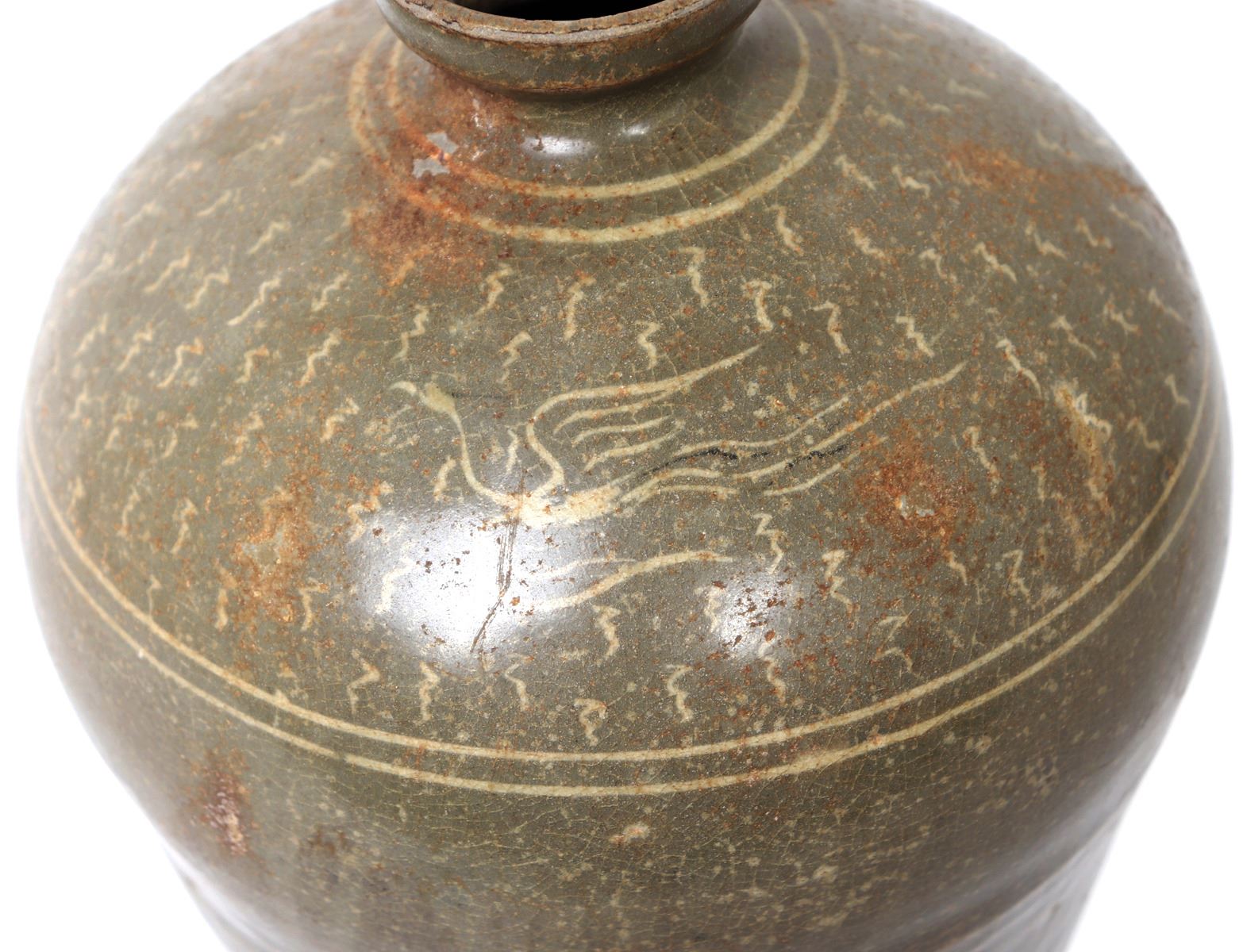 Antique Korean green celadon glazed vase hand thrown into a lovely shape with a narrow body and wide shoulders. Shoulders are dual banded in a cream white with birds in flight among rain or cloud whisps. Size 11" H. Condition: Good overall condition with minor wear commensurate with age.