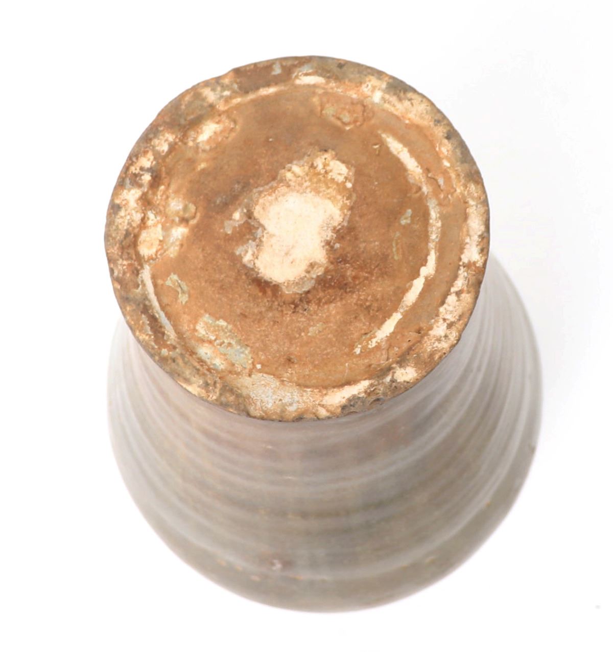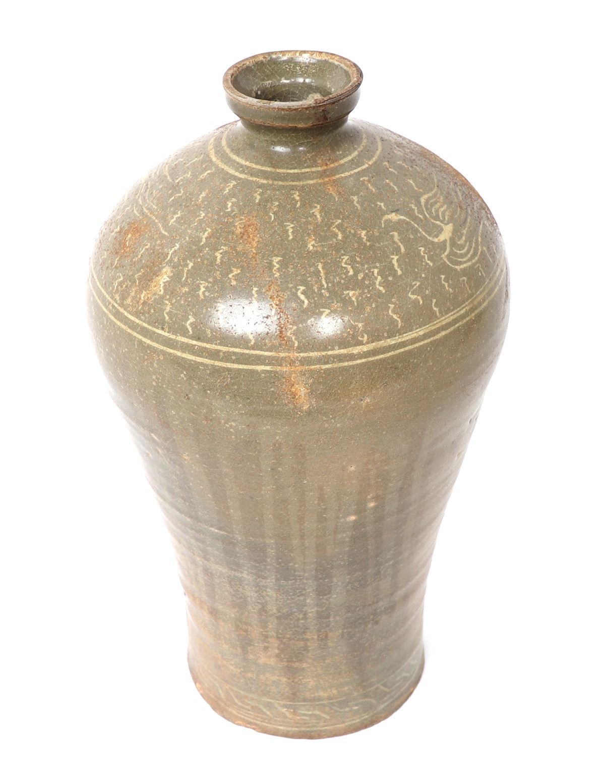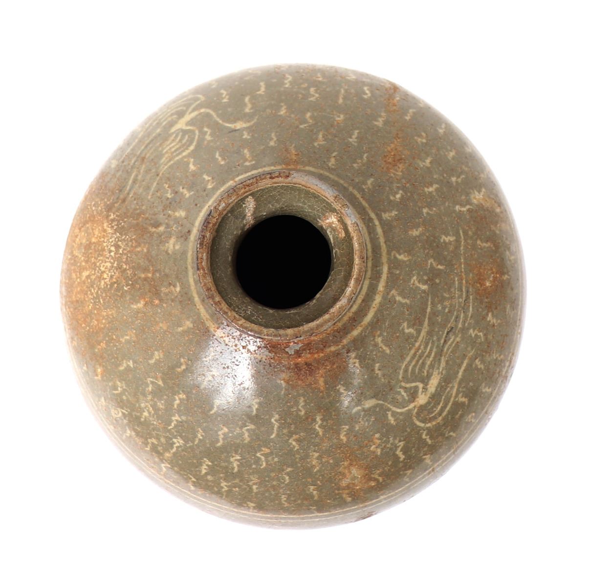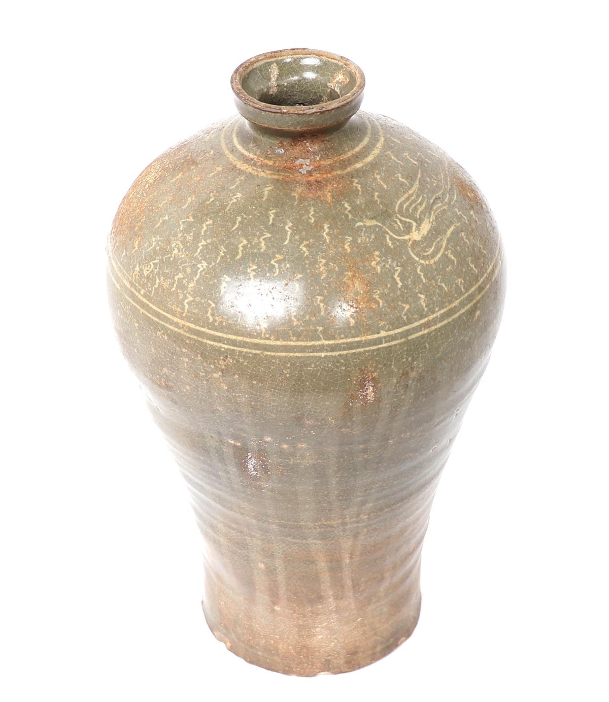 Antique Korean green celadon glazed vase hand thrown into a lovely shape with a narrow body and wide shoulders. Shoulders are dual banded in a cream white with birds in flight among rain or cloud whisps. Size 11" H. Condition: Good overall condition with minor wear commensurate with age.