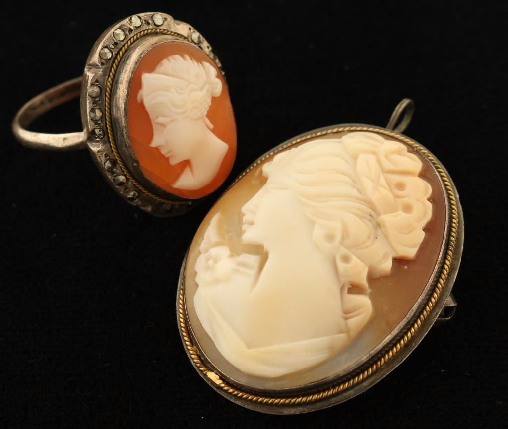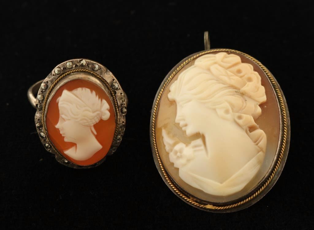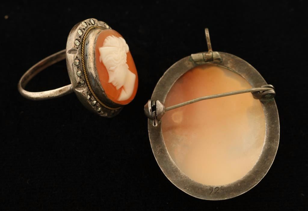 Brooch has woman with upswept hair wearing a flower on her shoulder with an orange background, the back is marked '925' and also has a loop to be used as a pendant. Ring also has woman with hair up wearing a headpiece and earring.