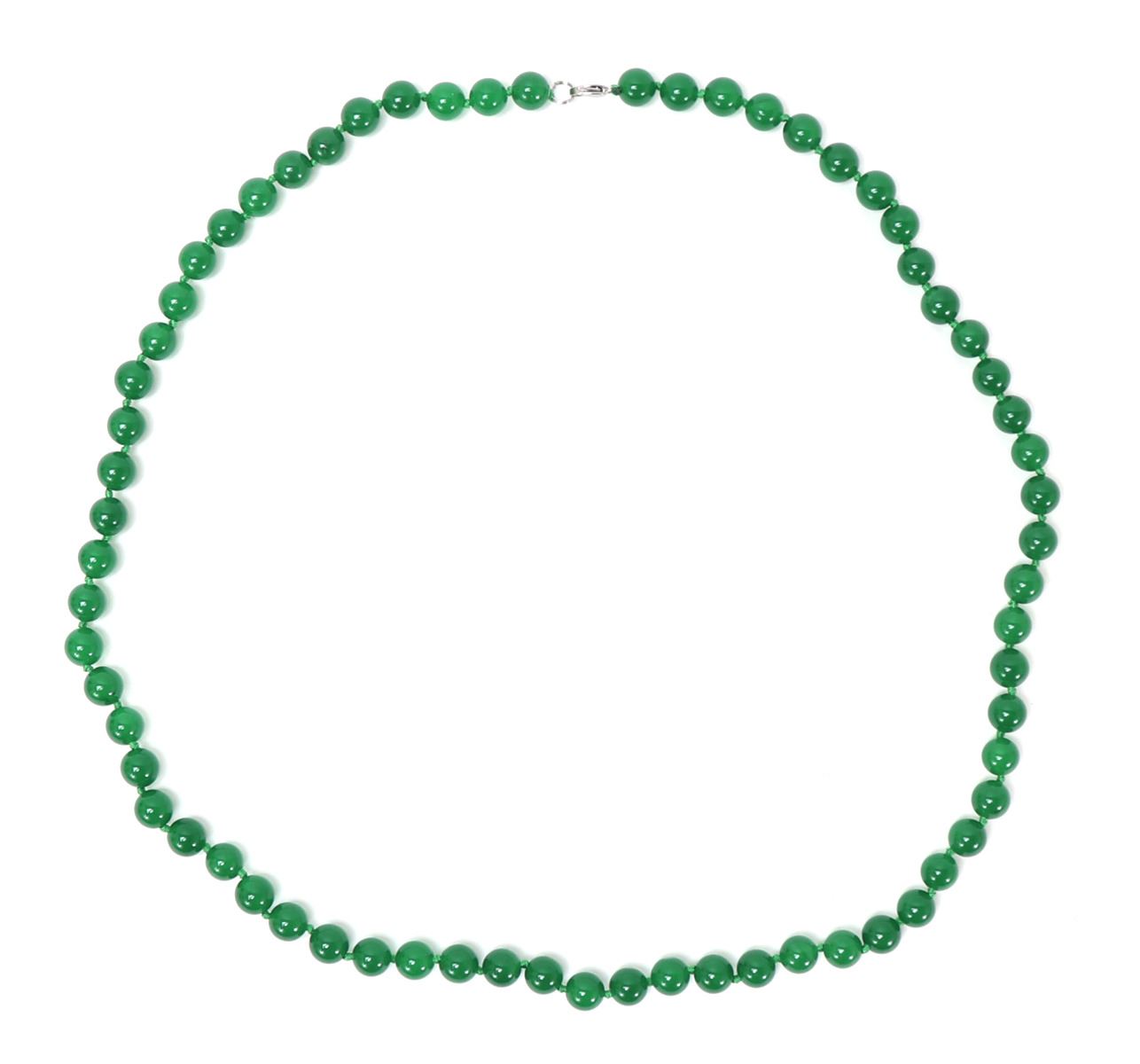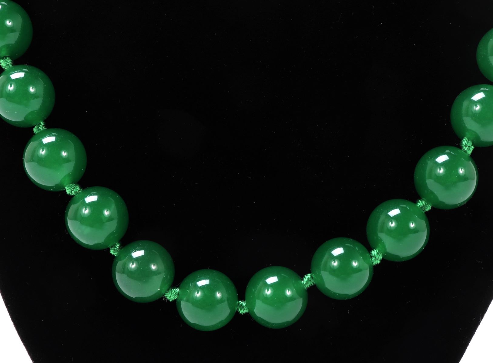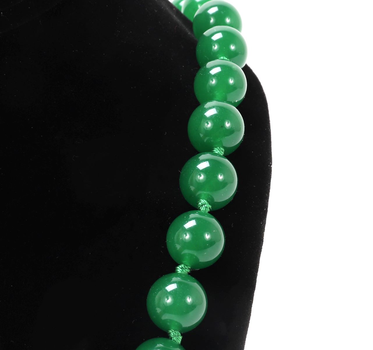 Gorgeous vibrant green Chinese jade style beaded necklace with a sterling silver clasp, and matching green silk thread. Size Neck 34" L. Condition: Wonderful wearable condition throughout.