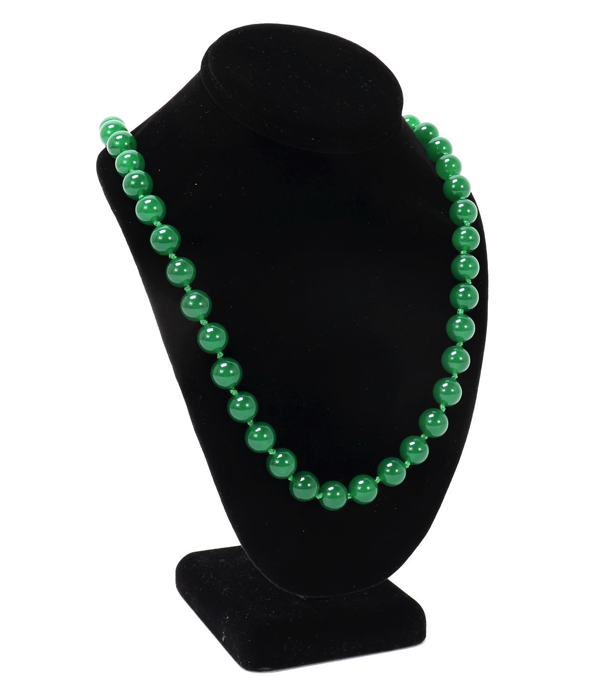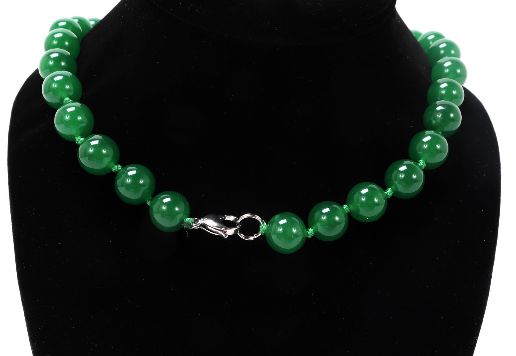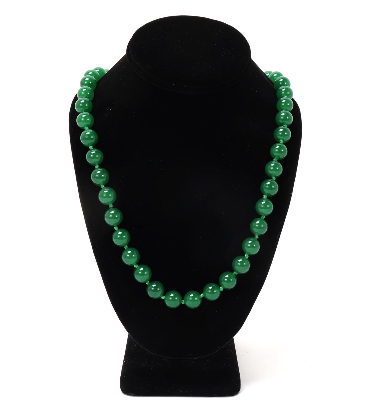 Gorgeous vibrant green Chinese jade style beaded necklace with a sterling silver clasp, and matching green silk thread. Size Neck 34" L. Condition: Wonderful wearable condition throughout.