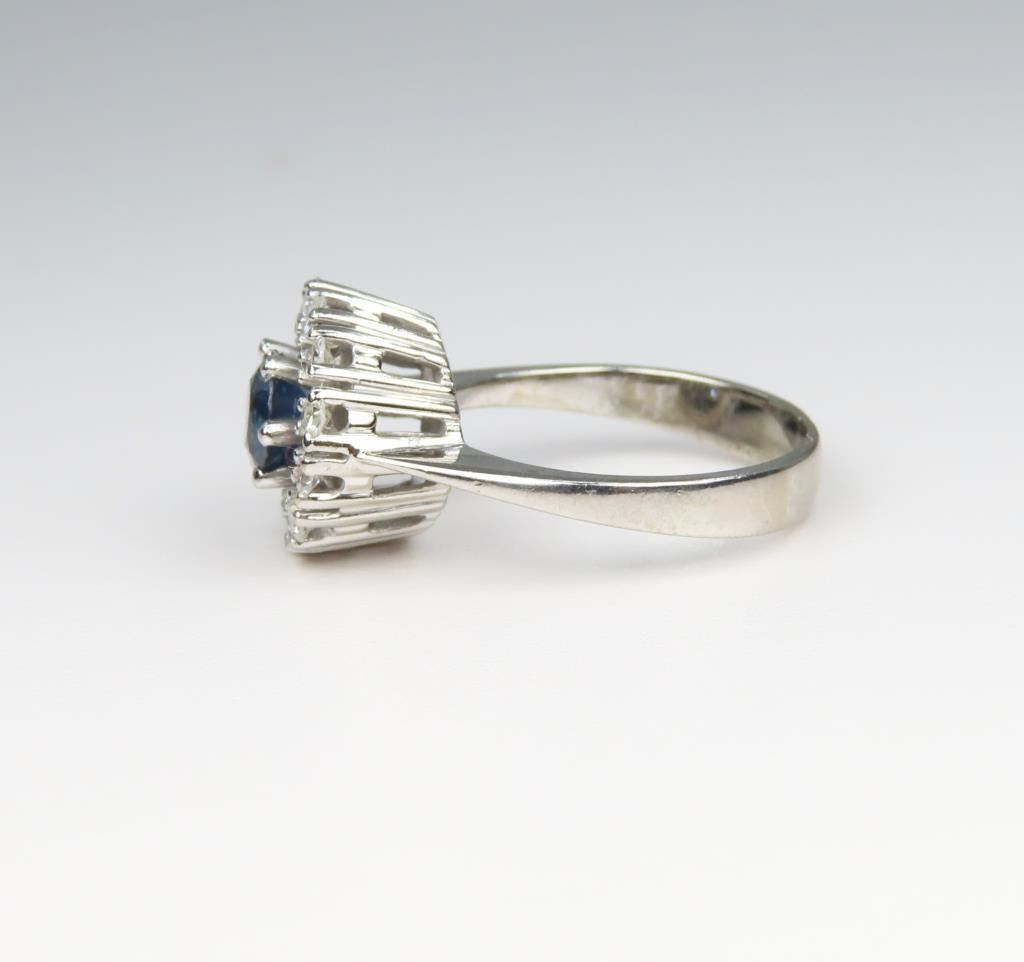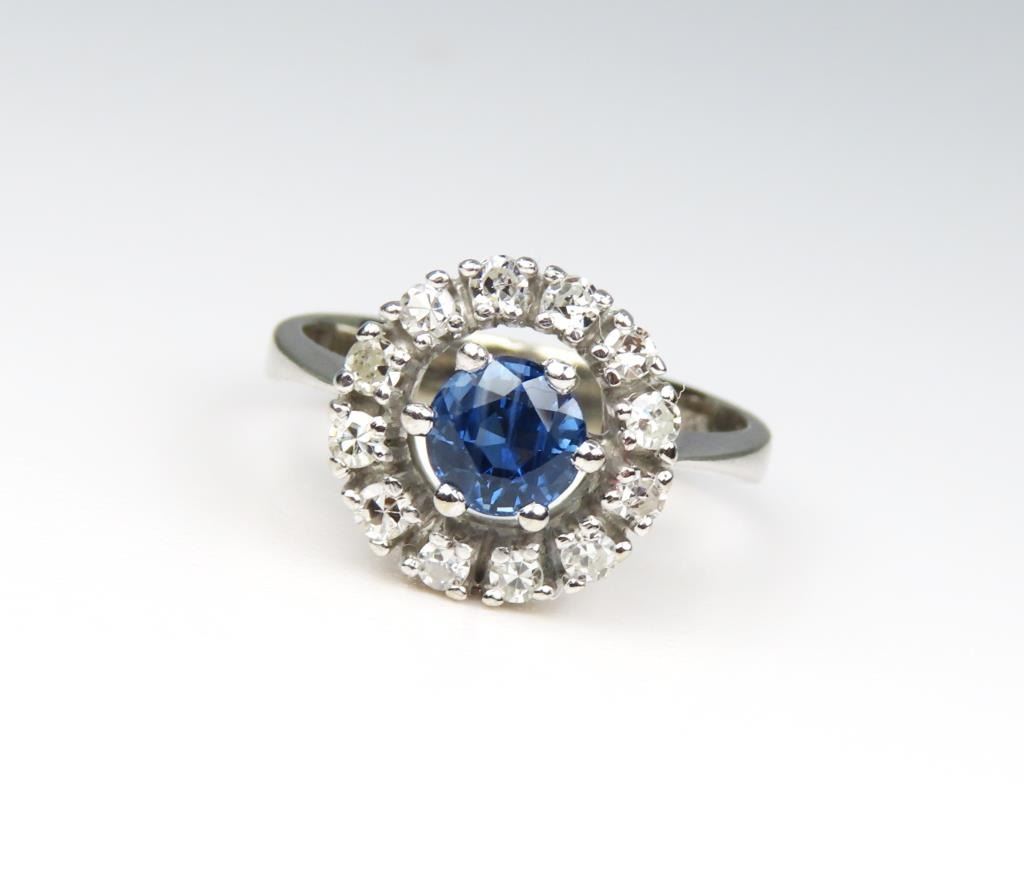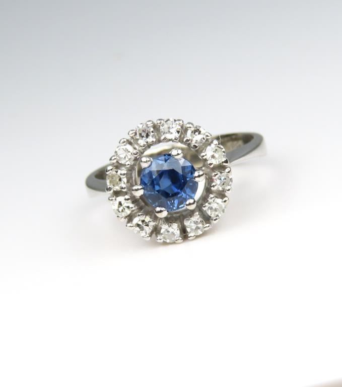 and Diamond Ring featuring a round cut Blue Sapphire weighing approx. 0.50 encircled with 12 round cut Diamonds with G-H colors and VS clarity weighting approx. 0.50 carats set in a 14 karat white gold setting, Size 4.