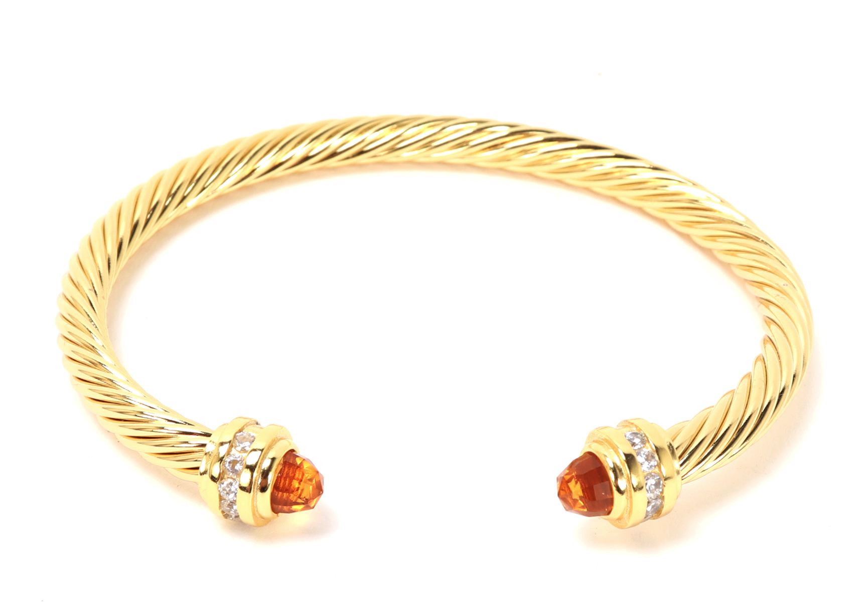 Lovely David Yurman style bracelet, featuring elegant twisted cable design with a polished gold finish. Each end capped with vibrant orange stones, accented by a row of sparkling, clear gemstones. Size 2 1/4" W. Condition: Wonderful wearable condition throughout. Made in the style of David Yurman, not an actual David Yurman piece.