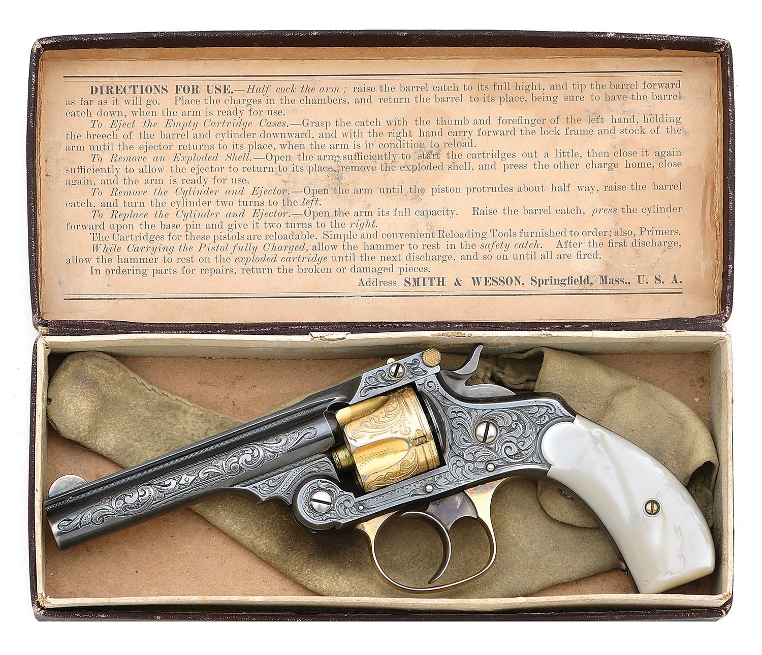 serial #99584, 32 S&W, 3 1/2" barrel with a bright excellent bore. This lovely Fourth Model remains in excellent overall condition, retaining 98% silver finish, thinning lightly throughout with the balance toning to a lovely dark gray tarnish. It shows some very fine high edge wear throughout, focused chiefly at the heels of the gripstrap, with a few scattered light handling marks here or there and very mild oxidation staining visible under direct light. The triggerguard, cylinder, and rear sight latch retain 98% gold-washed finish, showing to silver on the high edges, with the cylinder displaying a mild ring and the hammer toning to a smoky gunmetal patina. This revolver displays handsome foliate scroll engraving with punch-dot backing throughout, absent along the belly, with zig-zag bordering in the protected areas of the barrel rib and intertwined geometric motifs on the rear and top straps. The smooth mother-of-pearl grips remain in pristine condition, showing excellent fit and no handling wear or discoloration to speak of, and the grip screw retains all of its gold-colored finish. Timing and lockup appear sound and the ejector functions robustly with strong spring and snap. Included with this lovely revolver is the original hinged brown cardboard box, correctly end-labeled to the gun and remaining in excellent overall condition, as well as a period chamois purse holster which remains near-excellent showing only light soiling. This is a beautiful and high-condition Fourth Model DA. (26A10826-466) {ANTIQUE} [Dr. W. Lloyd Hudson Jr. Collection] (2000/3000)