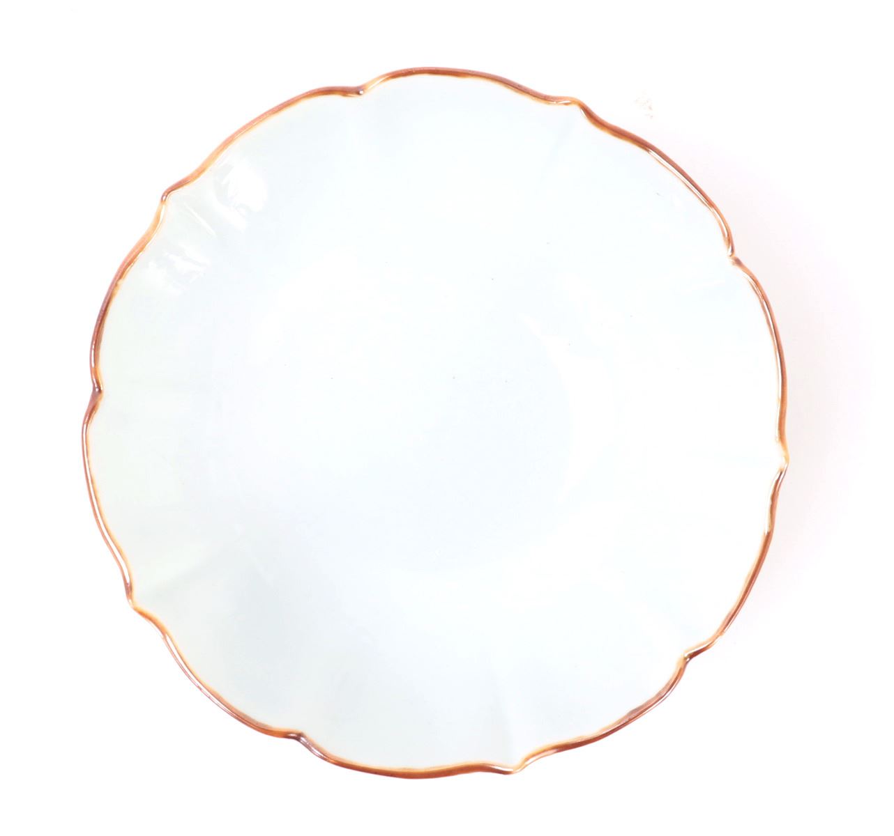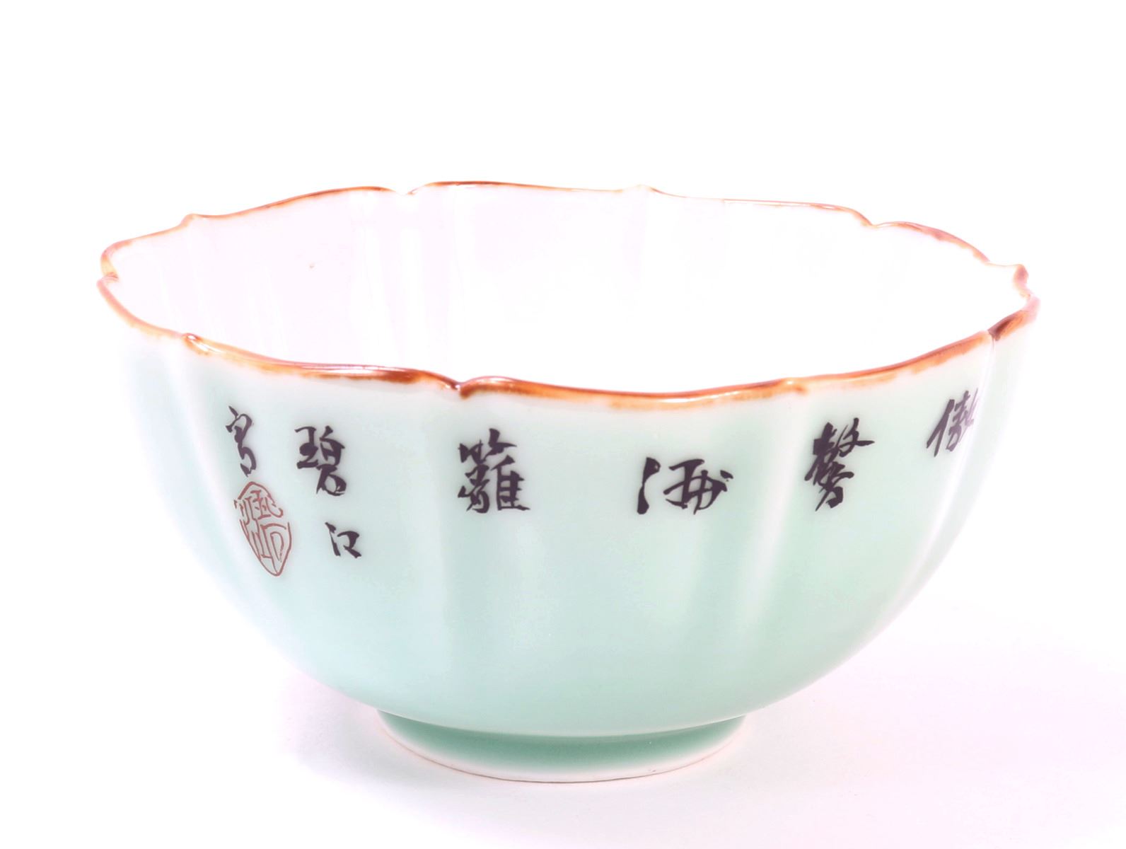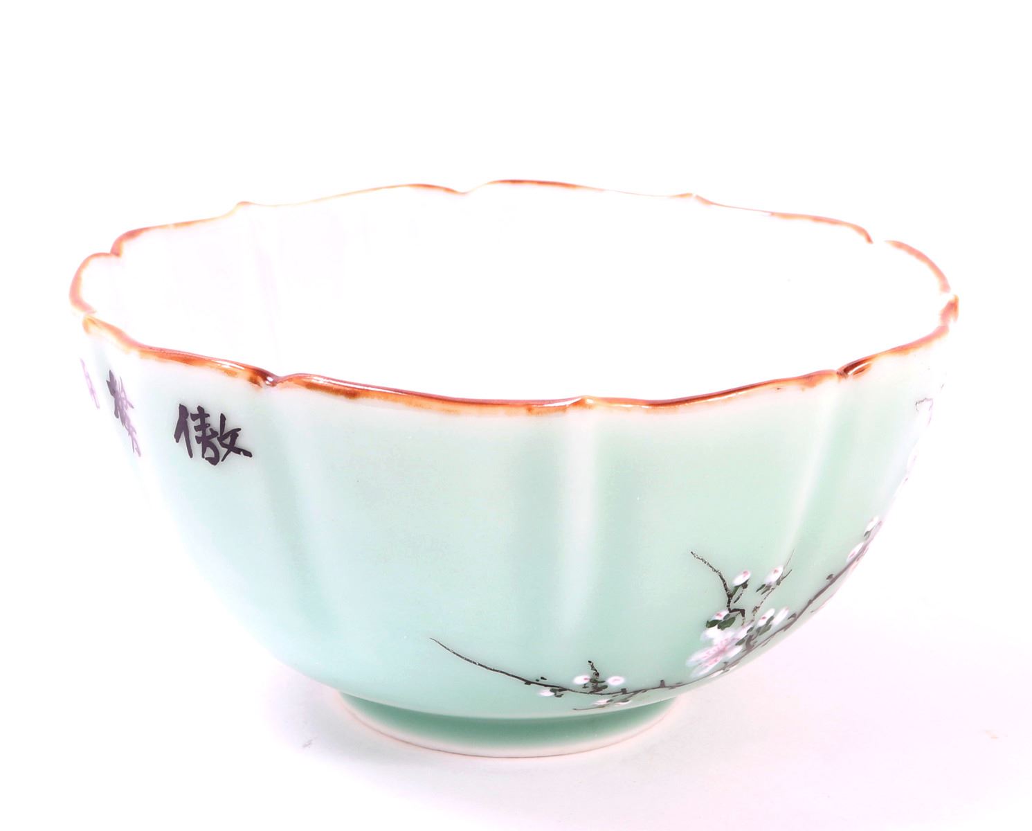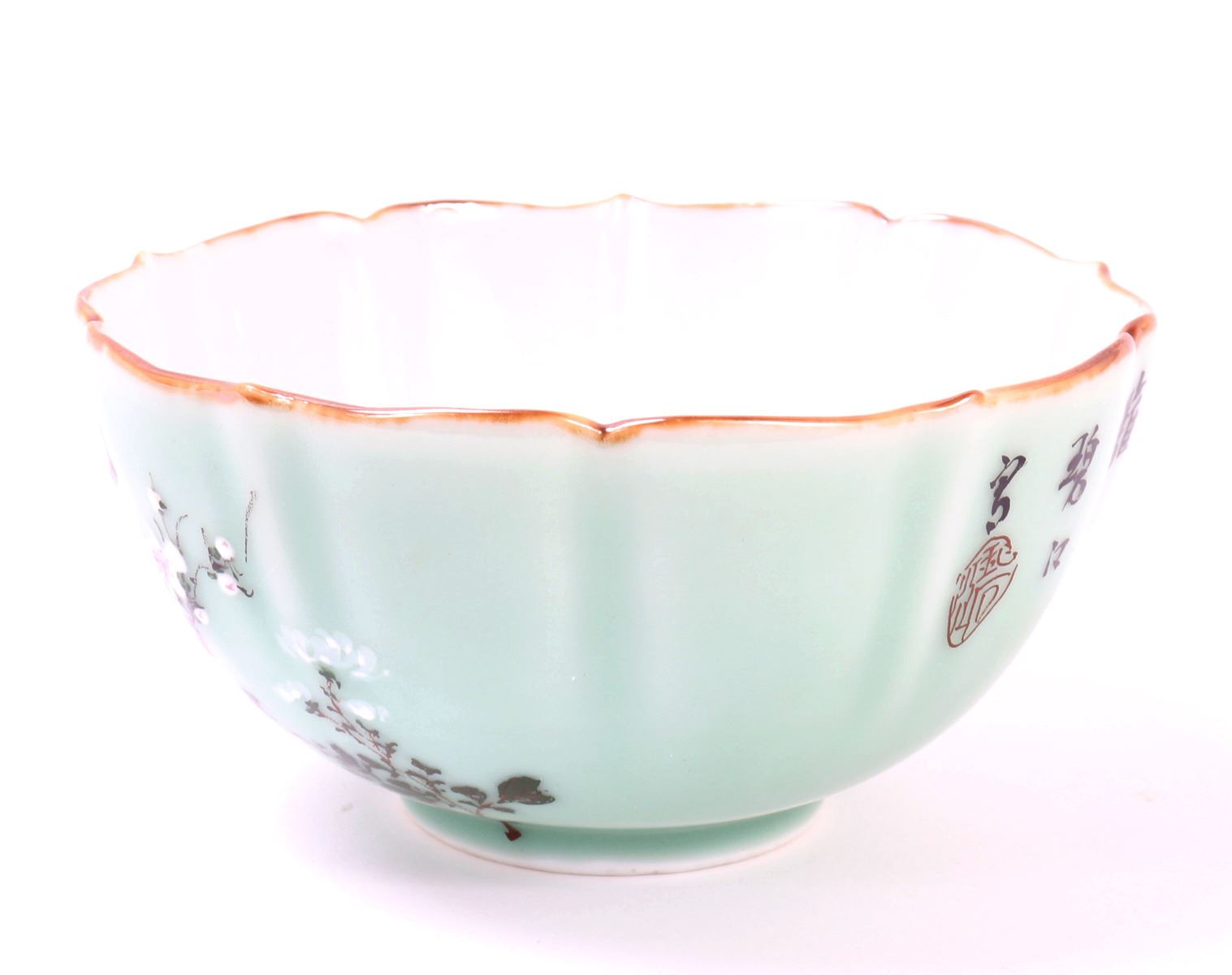 Early Japanese green celadon glazed bowl with a beautiful gold painted rim. Exterior of the body includes a gorgeous array of cherry blossoms with a wonderful ribbed body leading to a scalloped rim. Six character mark to the base in cobalt blue with a blue ring. Size 5 7/8" W. Condition: Wonderful condition throughout.