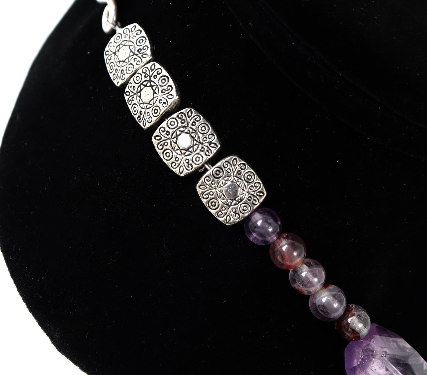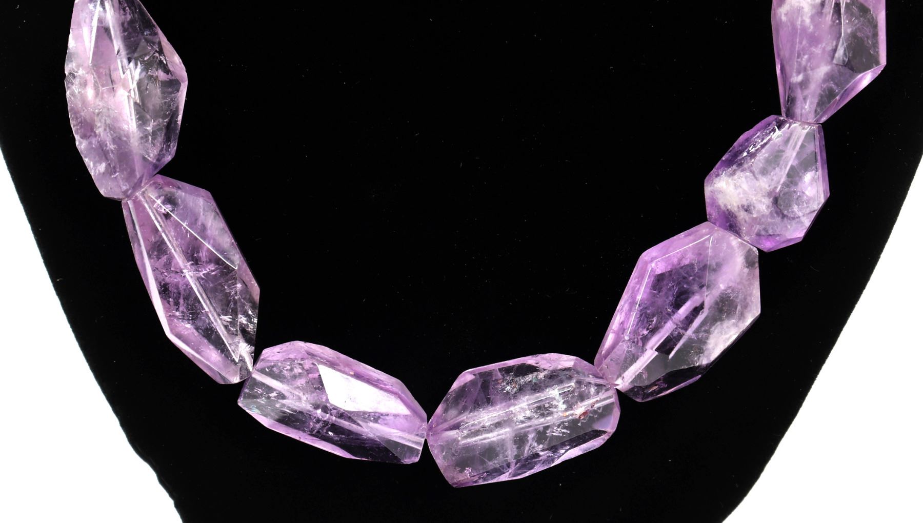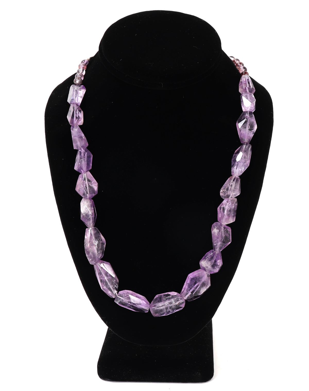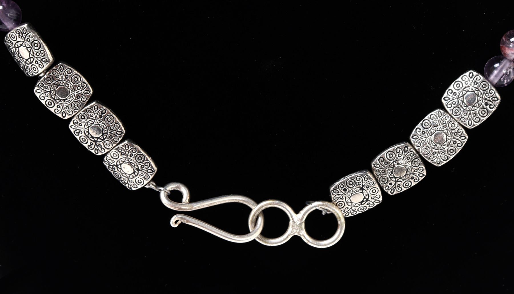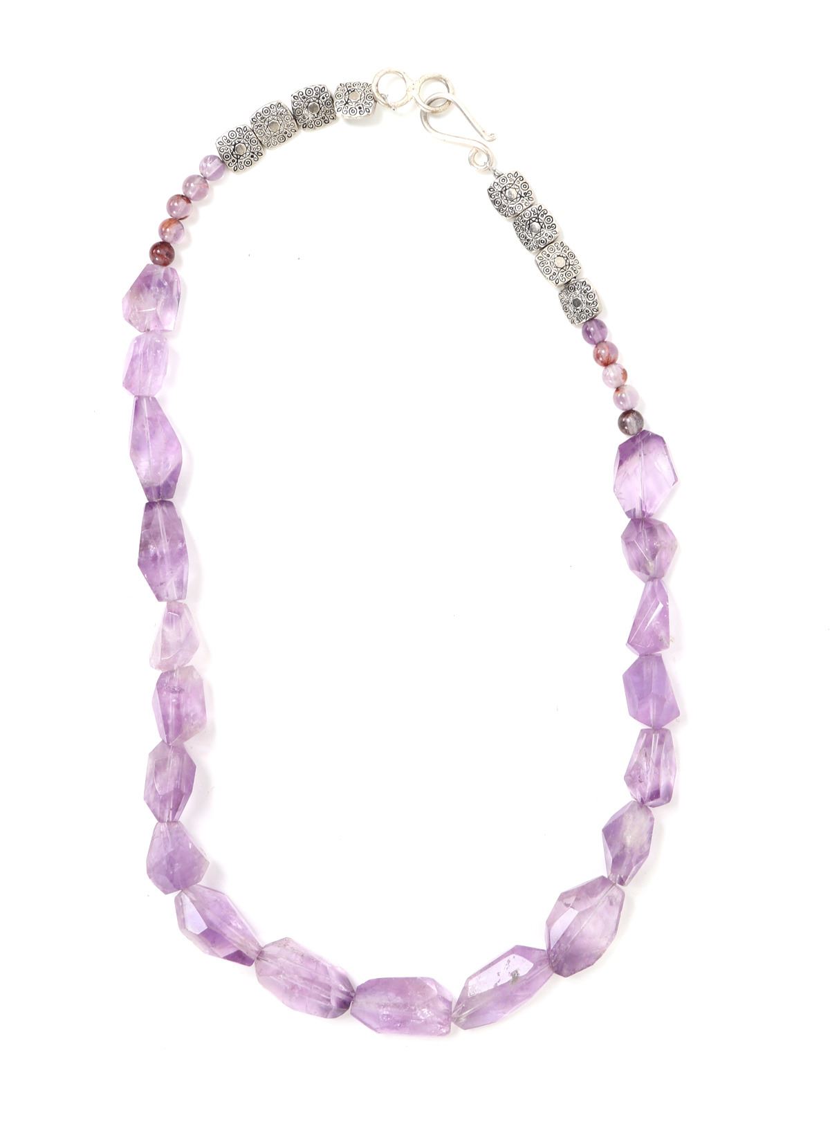 Beautiful light purple chunky amethyst necklace with silver style clasps with floral incised beads to the reverse. Dozens of beautiful almost translucent beads with gemstone style cut. Size 20 1/2" L. Condition: Lovely wearable condition.
