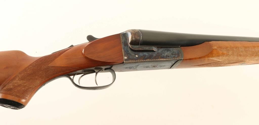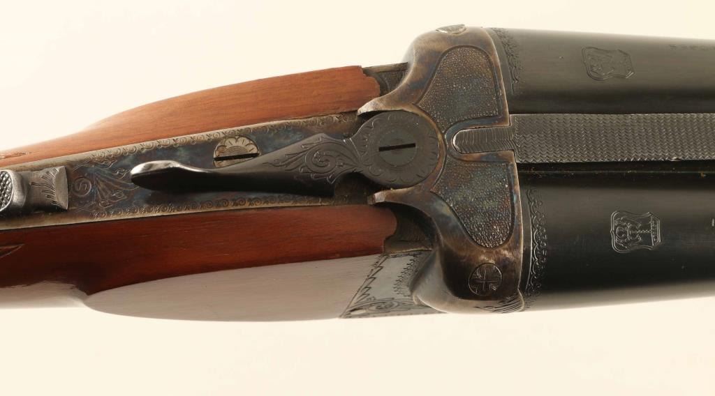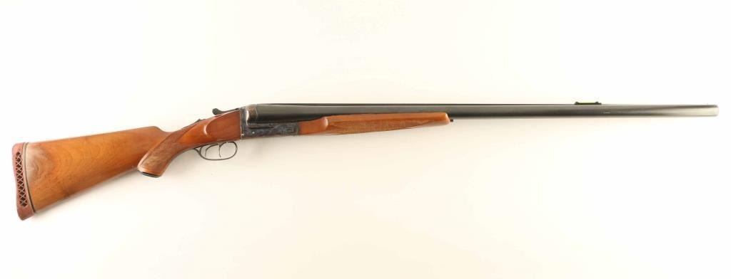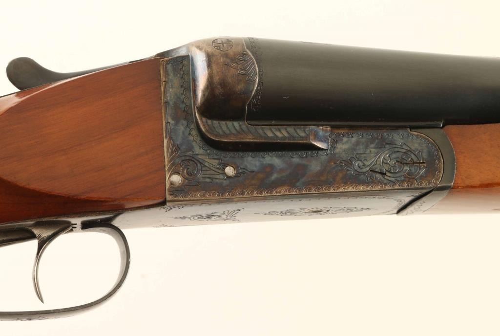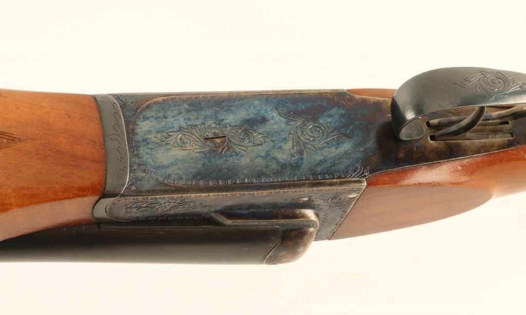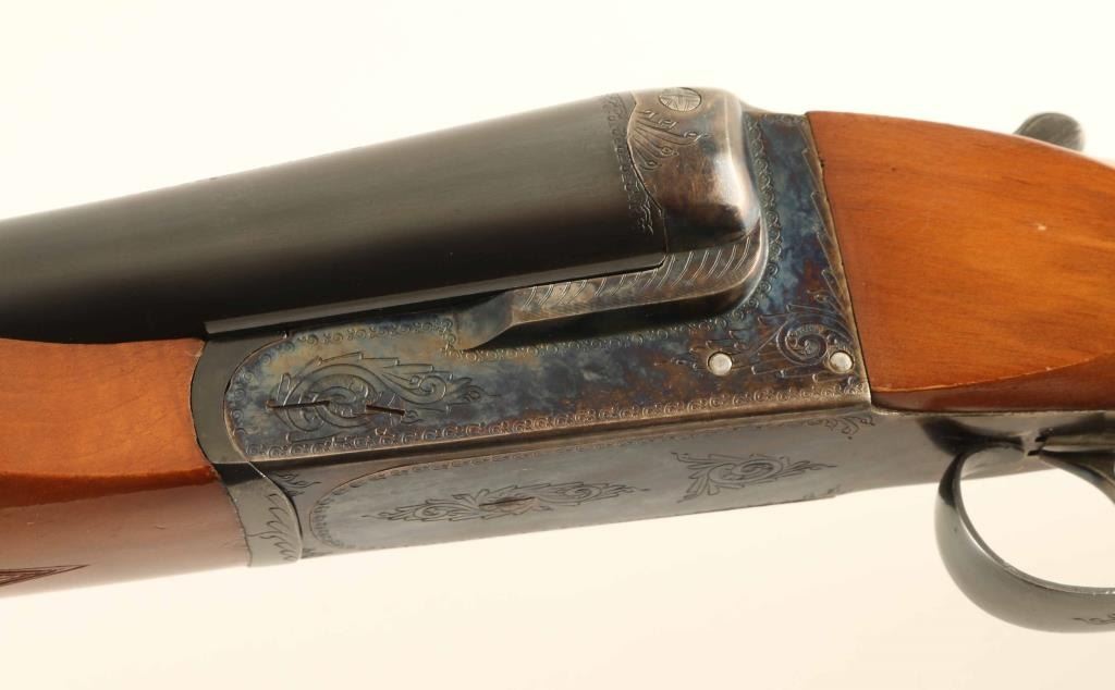Spanish double barrel side-by-side shotgun, imported by Jana, Denver CO. Accepts 3-1/2" shells. Features Greener cross bolt, blued barrels, case color action, checkered wood beavertail forend, wood pistol grip butt with checkering at wrist, ventilated rubber recoil pad, 32" barrels with steel front bead, fiber optic insert mid bead, internal hammers, double triggers, tang safety, ejectors. Bores are very good condition, with extra full chokes. Retains 80% bluing with scratches and scuffs to barrel, bare metal showing on some sharp edges. Case color on receiver is bright, showing very little fading at corners. Wood is very good condition with few scratches and dents, several small spots of bare wood at butt. Recoil pad has gone hard, needs replacement. Approx stock measurements: 14-1/2" Length of Pull, 1-1/2" Drop at Comb, 2-3/4" Drop at Heel. Engraved "LOYOLA" shields on both chambers. Receiver has stippled panels on top, floral scroll engraving on majority of flat surfaces. Condition is NRA Very Good *** Modern Firearm ***