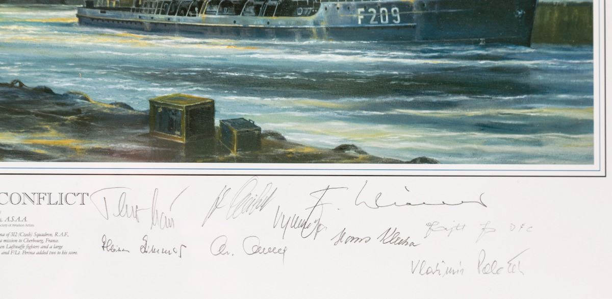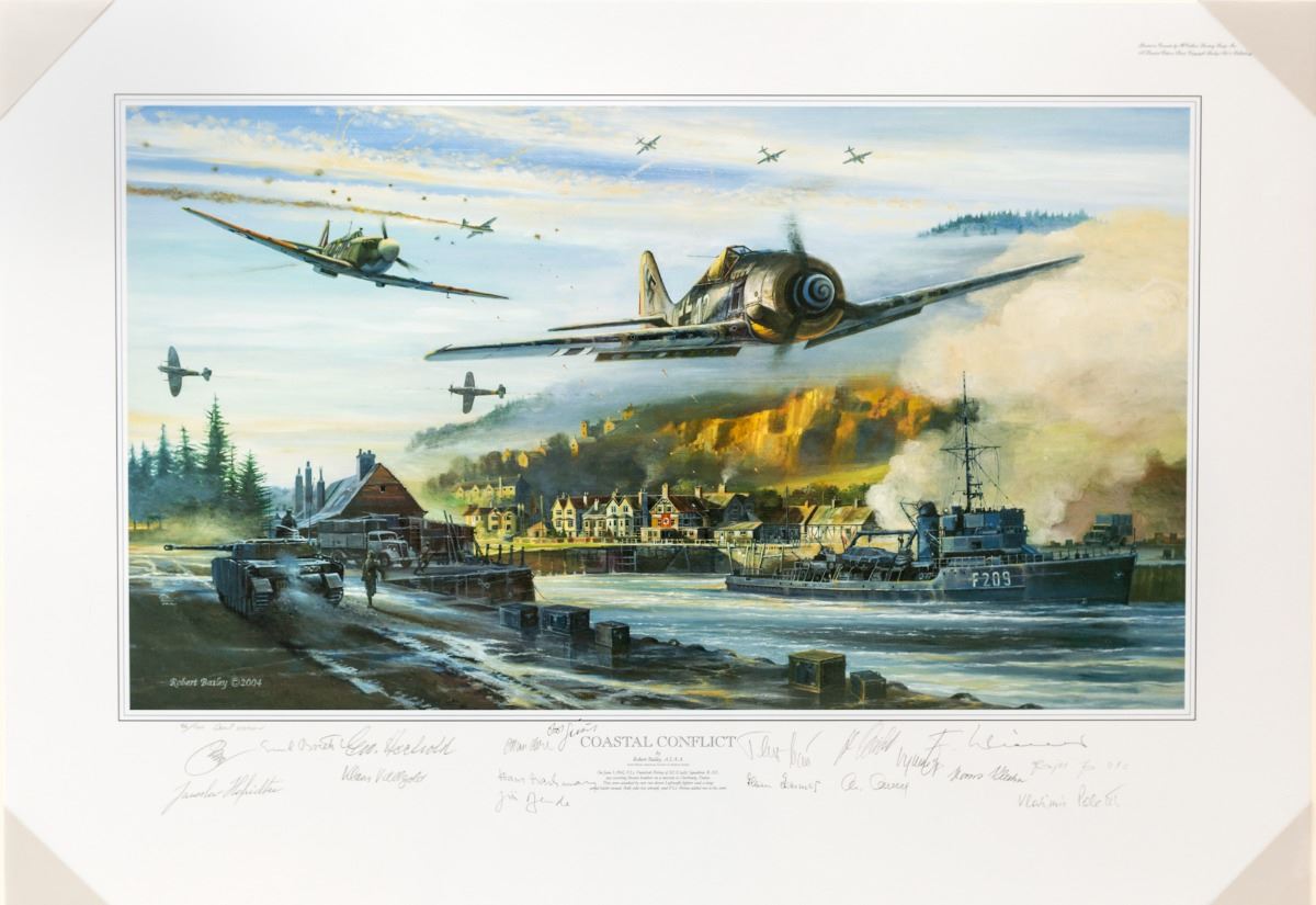 Limited Edition Print, entitled ''Coastal Conflict'', by Robert Bailey, #86/100, with seventeen original signatures. The print focuses on June 3, 1942, F/Lt. Frantisek Perina of 312 (Czech) Squadron, R.A.F., escorting Boston bombers on a mission to Chesbourg, France. Image size is approx. 14.5''x25'', unframed. Includes Certificate of Authenticity and smaller image of Spitfire Warrior, by Robert Bailey, #84/100, on reverse. Condition is excellent. Est.: $300-$500.