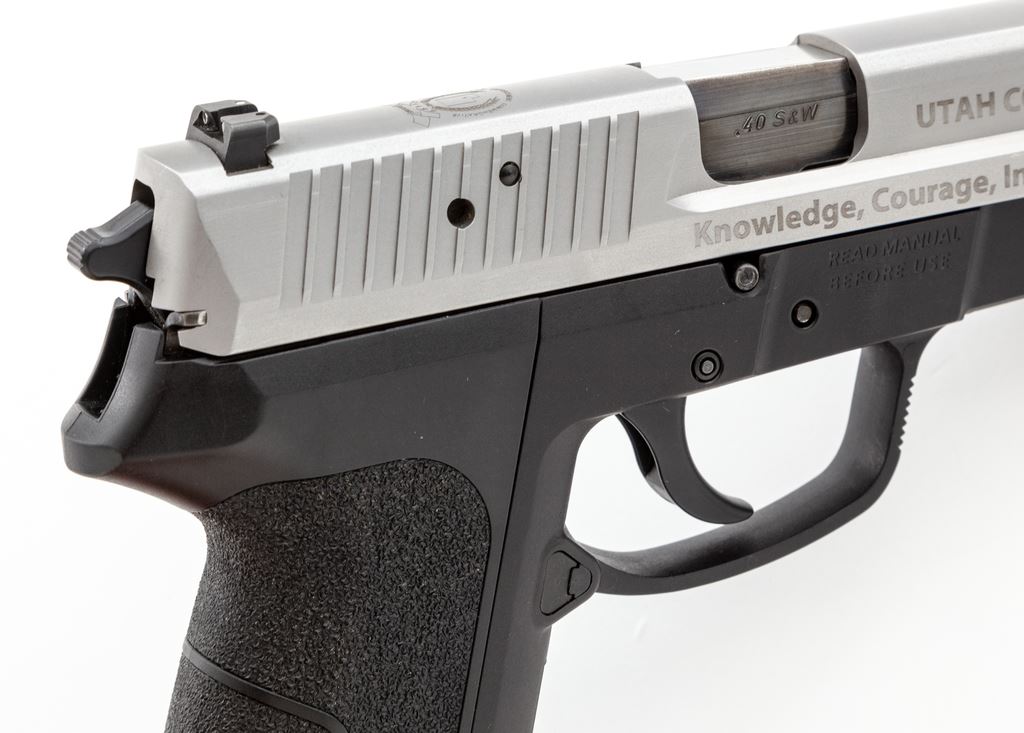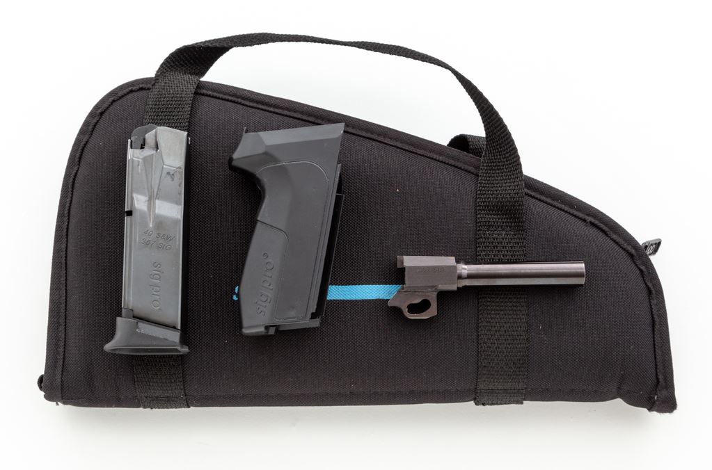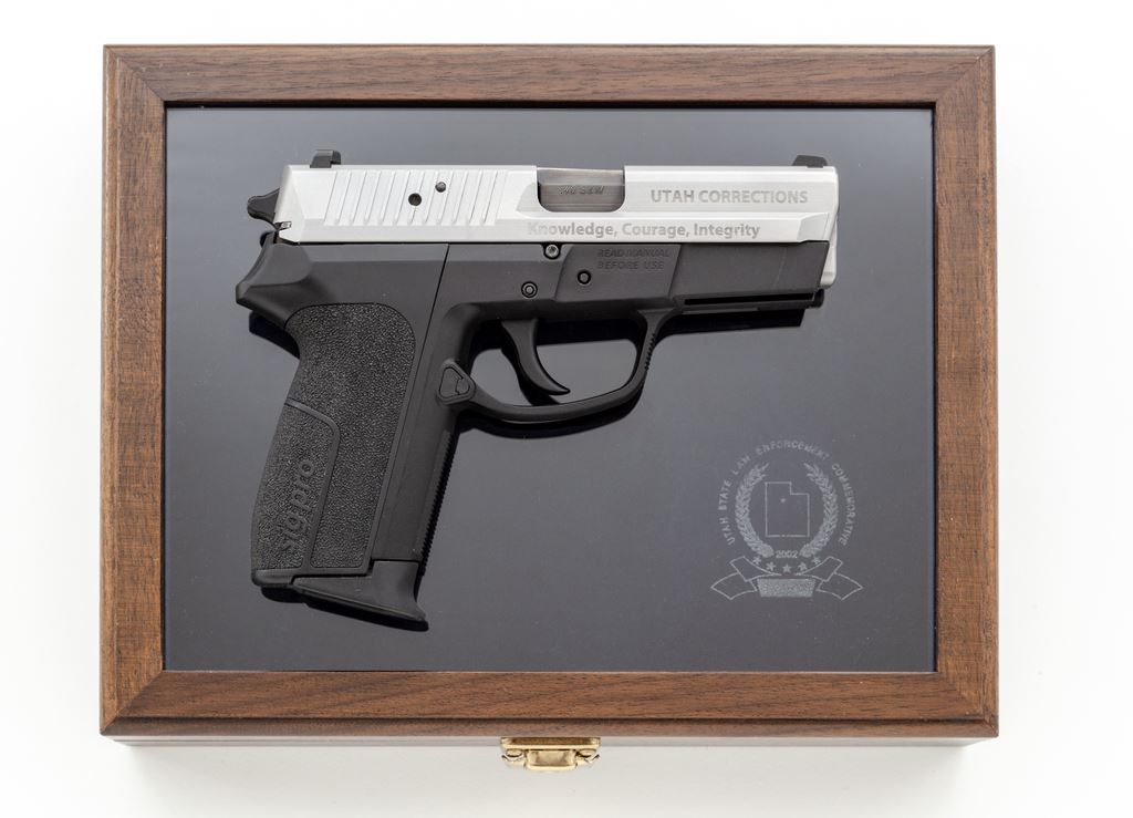 Limited Edition Sig Sauer Model SP2340 Utah Corrections Commemorative Pistol, #SP0055455, and this pistol is #540 of 2002. Featuring a 3.75'' 40 S&W barrel and a 3.75'' .357 SIG barrel, satin stainless slide, black polymer frame, and 3-dot night sights; night sights are very dim at this point. Right side of slide is marked ''UTAH CORRECTIONS'' and ''Knowledge, Courage, Integrity''; top with Utah State Law Enforcement Commemorative Crest. Includes two (2) factory 10-round magazines, extra interchangeable backstrap, blue plastic case with matching end label, owner's manual, padded Sig soft case, and glass-topped wood display case. The display case also with the commemorative crest on the lower corner of the glass as well as fitted blue foam interior. Pistol is in near excellent condition. Slide with a few scattered light scratches; frame shows normal light handling marks, with an excellent smooth action and bright bore. Wood display case appears as new. Est.: $900-$1,200. (Modern/PPT)