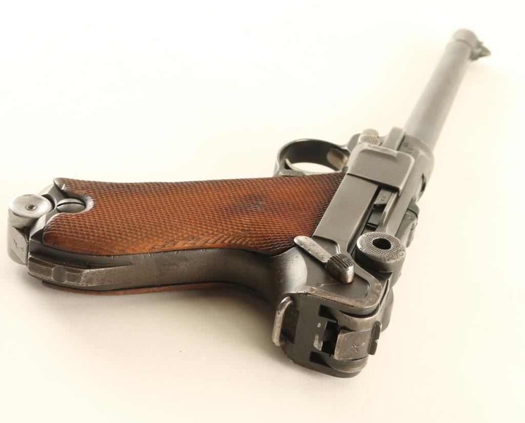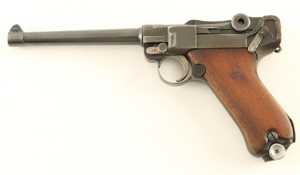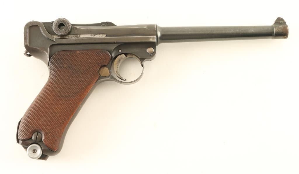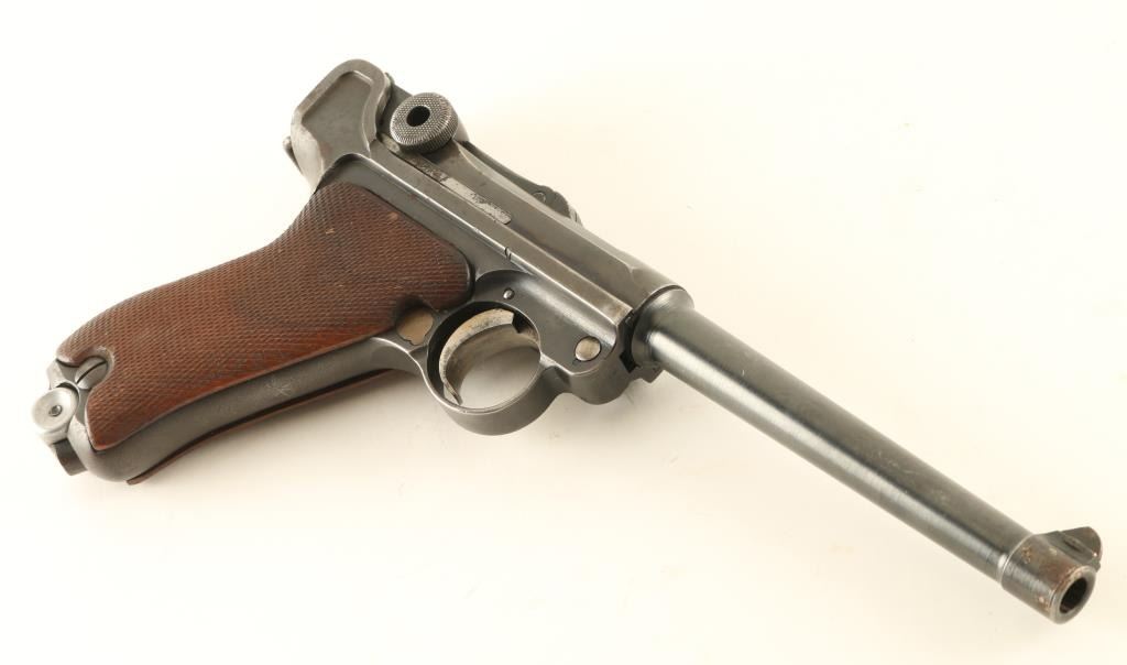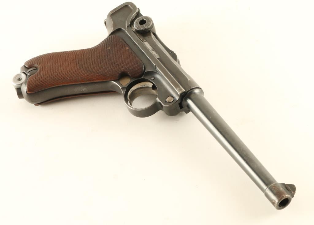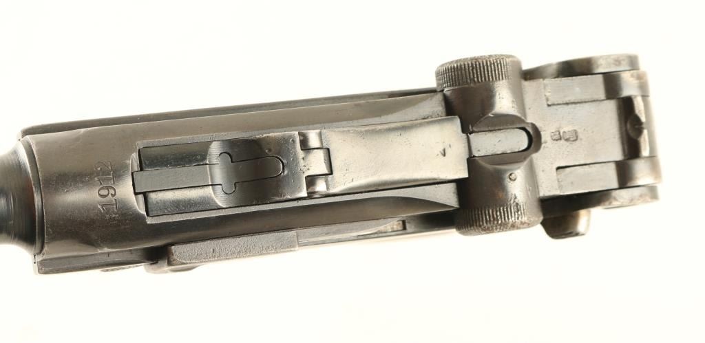 German military semiautomatic pistol features blued finish, checkered wood grips, 6" barrel, fixed sights, single action trigger, frame mounted manual safety, push button magazine release. Appears to be a Navy Luger barrel mounted to a P08 frame, with many mismatched parts. Bore is good shootable condition, with strong rifling, dark pitted grooves. Trigger, mag release and takedown lever have a thin straw finish. Toggle parts appear refinished, with darker blue over pitting, markings dished out or removed, no maker mark o5 n toggle. Even 75% coverage of bluing with bare metal on edges, high spots, at muzzle. Grips are good condition, discolored, a bit loose, extend past metal at front strap. No importer marks observed. Crown over "BV" on left side of 1912 dated slide. Includes one magazine with aluminum bottom plug. Condition is NRA Good+ *** C&R Firearm ***