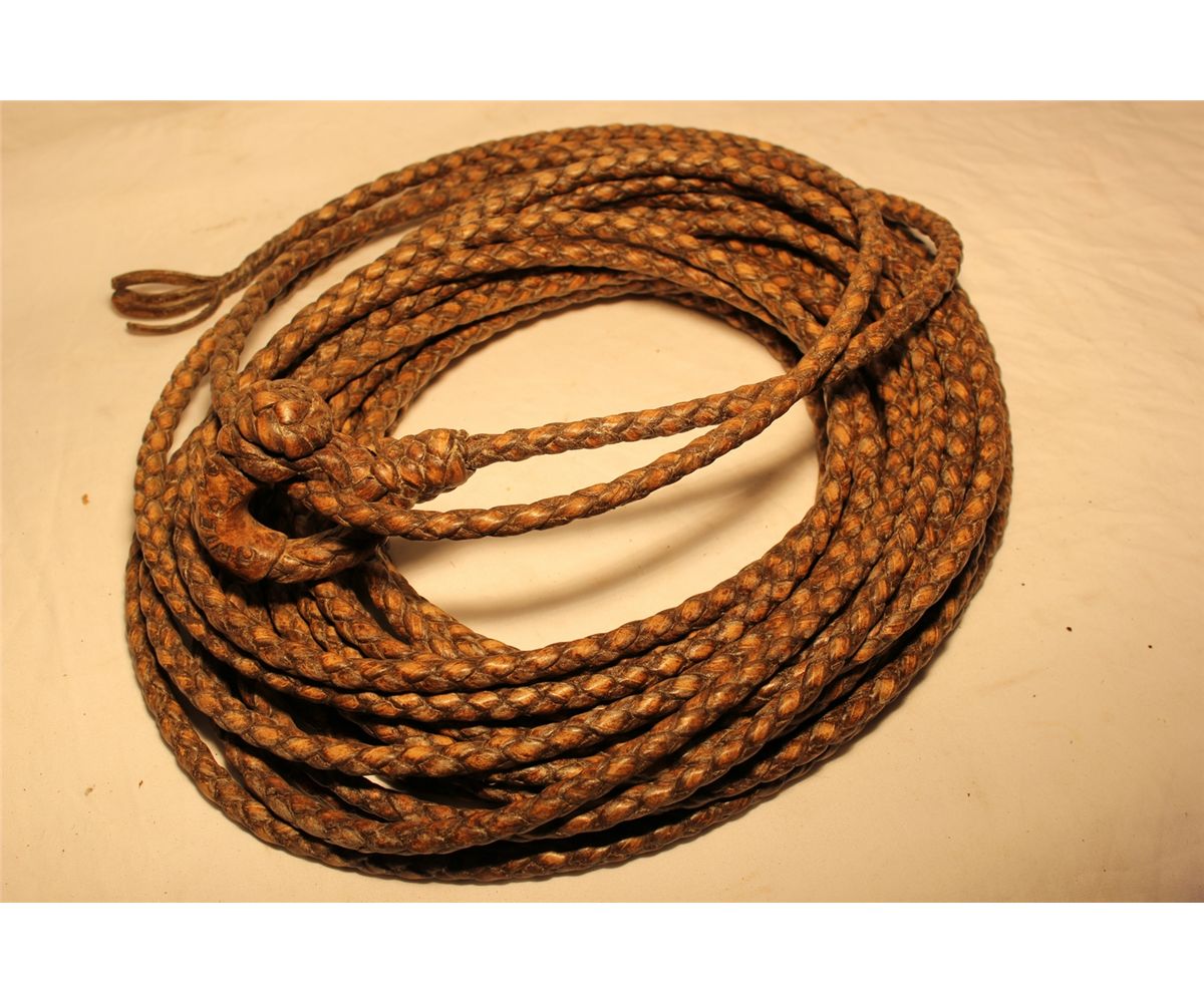 Ortega Rawhide Riata; approximately 42ft. long, 4 plait, nicely marked on the honda, and showing nice patina.