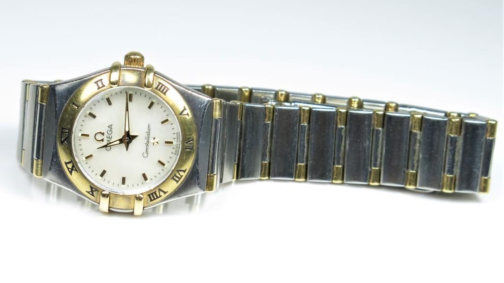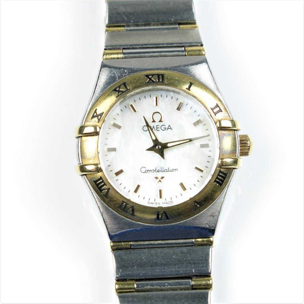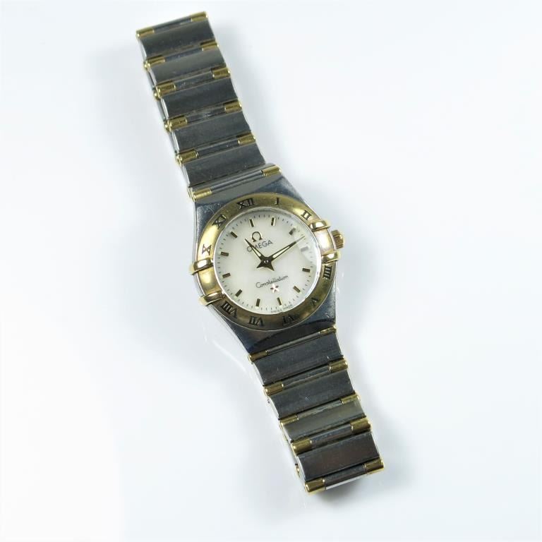 Luxury Ladies Omega Constellation Watch crafted in 18 karat yellow gold and contrasting stainless steel watch in good condition. Retail $3,000.00 Estimates $1,200-$2,000 Reserve $1,500-$2,000