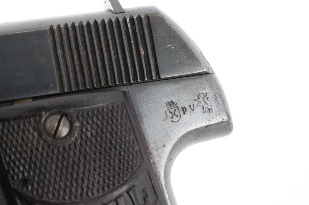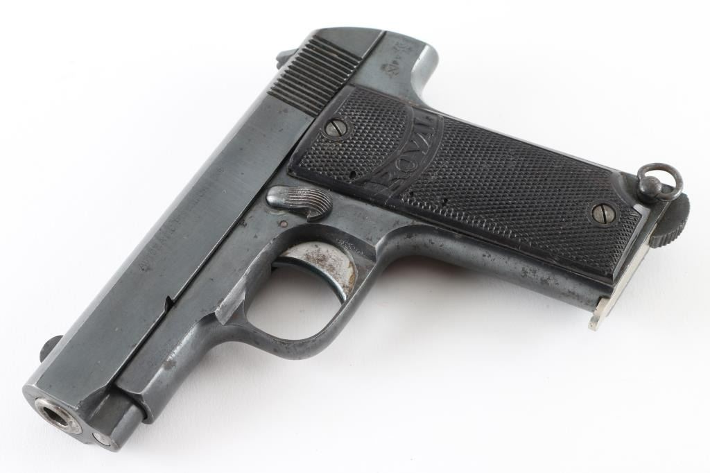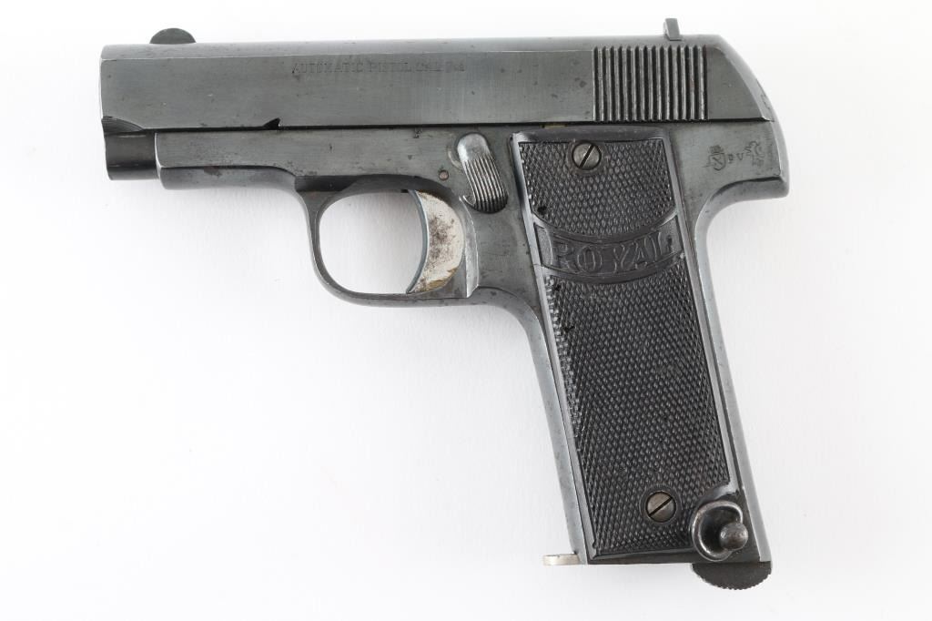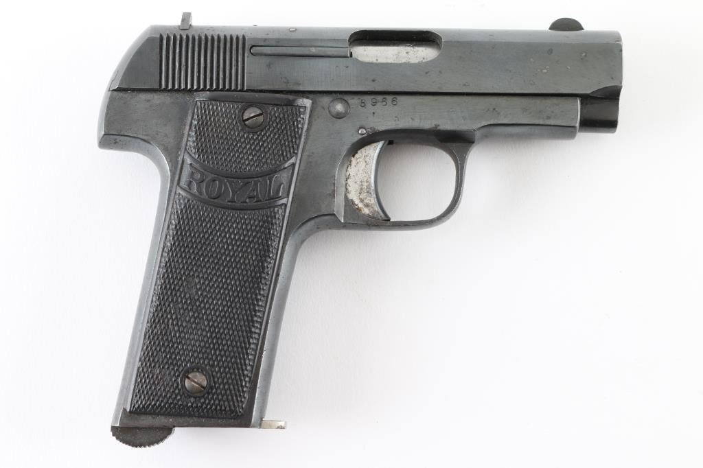 "Ruby" pattern pistol manufactured in Eibar, Spain in the 1920's for export to the U.S., and Europe. Mid-size frame, 12 rd magazine, lanyard ring. "Automatic Pistol Ca. 7.65 " on slide, Spanish proofs on frame. Manual safety, black plastic "Royal" grips. 3.5" barrel. Bore is very good/bright. Action is crisp/tight. Grips are good except the left panel has 3 small holes in it. Blue finish is about 94% with edge wear, and some light pin-prick pitting on the straps, and slide. NRA Condition-Good to Very Good as C&R firearm.
