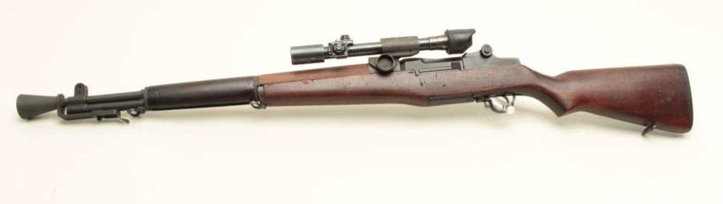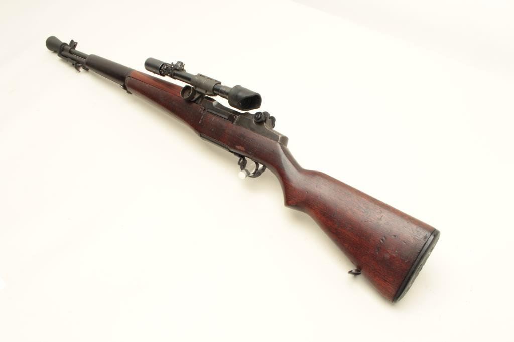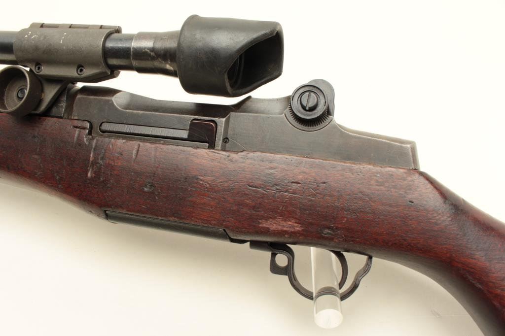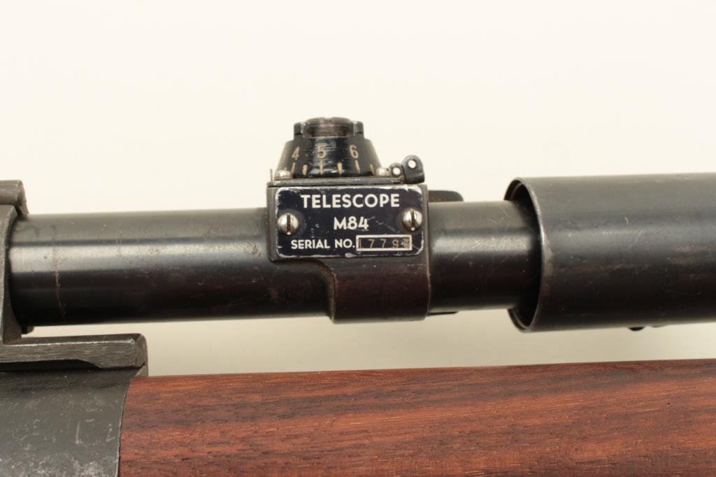 52” on the frame behind the sight and “S.A. 7-52” on the barrel. M-84 U.S. Issue scope on quick detachable proper mount numbered 7796. The rear hand guard is a replacement. 80%-90% arsenal reconditioned finish with slight loss at the edges. The stocks are good with “W.P.” proof in side of pistol grip and arsenal type dings, mars, and scratches. Bright bore that is very good to near excellent. Flask hider included. Generally, very good overall. (C&R) Est.: $1500-$3000