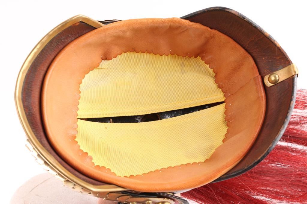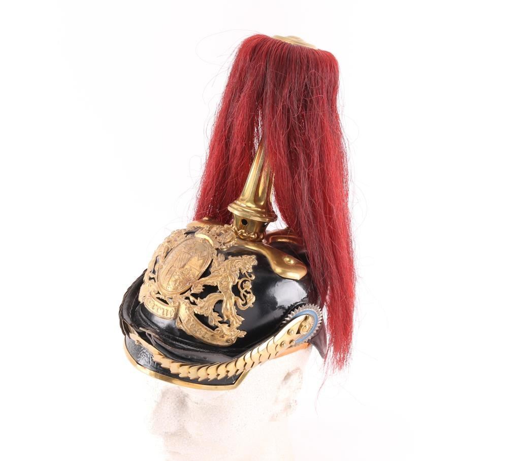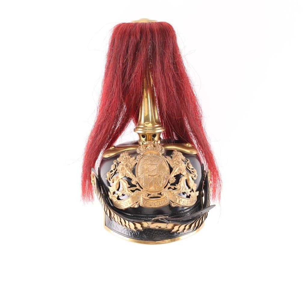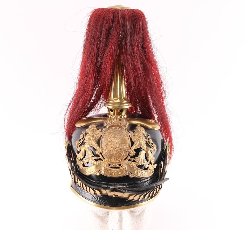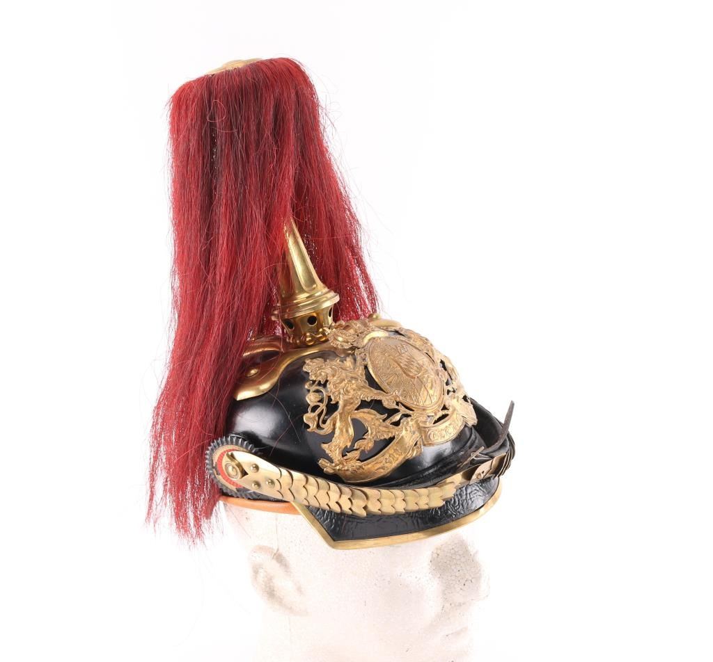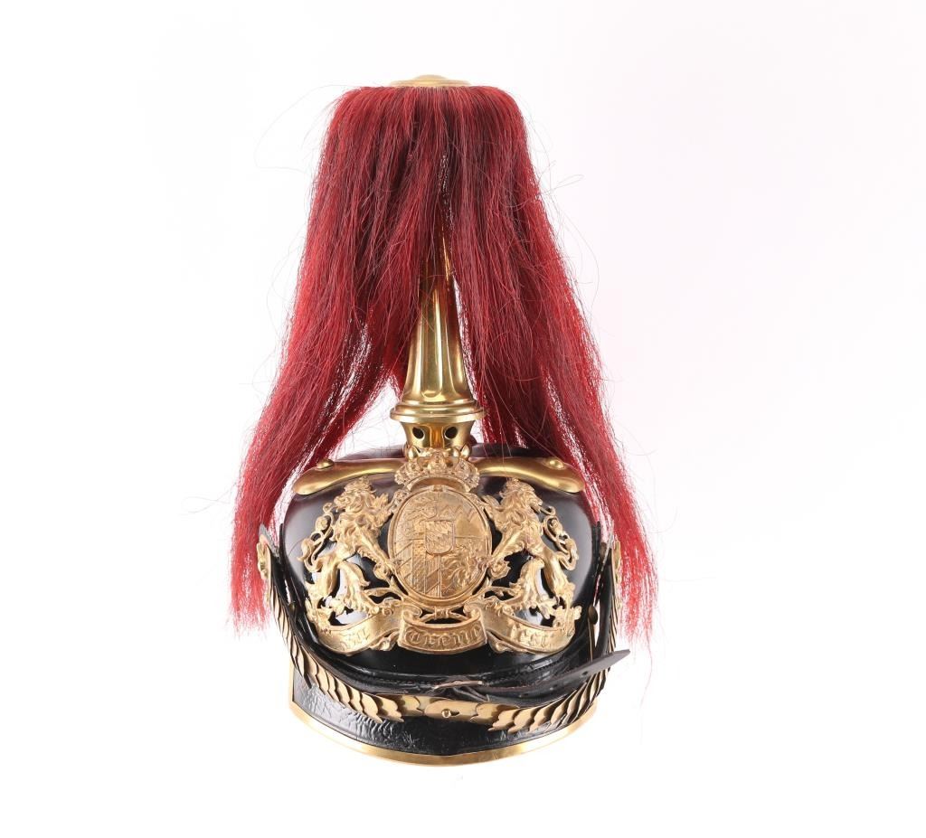 Original German WWI Bavarian M1886 Artillery Officer Pickelhaube Helmet with Tall Spike and Red Plume - As Used By The 8th Royal Bavarian Field Artillery "Prince Heinrich of Prussia" This helmet features a correct large model 1886 wappen (front plate) with the Bavarian coat of arms marked with the kingdoms motto, In Treue Fest, German for "steadfast in loyalty." The wappen is held in by the correct bolts used on officers models. The convex brass chin scales are in great shape, with complete leather backing front clasp and intact buckle. The only difference between an Infantry officers helmet and a Cavalry officers helmet (and Artillery until the adoption of the ball spike in 1916), is that infantry chinscales are flat, while Cavalry and Artillery chinscales are curved like this one. It is complete with multi-piece officers Bavarian (blue and white) and German National Colors (red white and black) Kokarden (cockades) around the chin strap lugs. In 1897 the new Reichs-Kokarde in Red-White-Black was introduced for all ranks to commemorate the 100th anniversary of the birth of Kaiser Wilhelm 1st. The Reichs-Kokarde was to be worn on the right side of the helmet, and the state Kokarde was moved to the left, as on this helmet. Consigner states he had some restoration done in the 1990s. All original except for the liner which is a newer replacement., and the leather appears to have been lacquered. Excellent Condition.