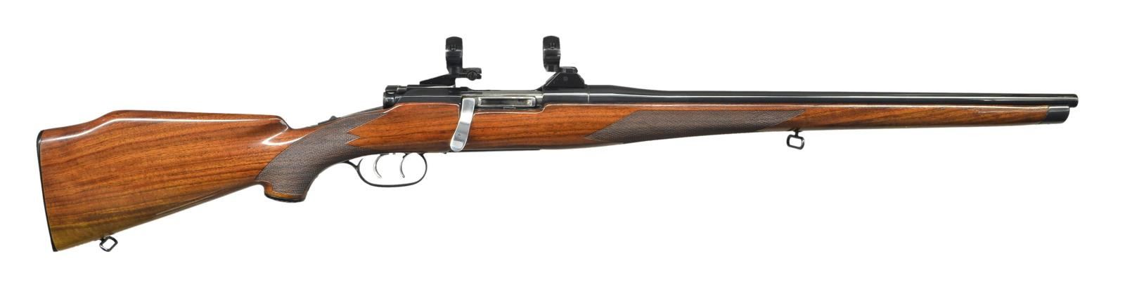 ACTION RIFLE. Cal. 6mm Rem. S# 1015. Bbl. 20" marked "JW Carlson" plus caliber; no provision for sights. Mfg. by Steyr originally as Greek military rifle Model Y1903/14. Bolt handle altered to sporting butterknife configuration plus double set triggers. Replacement gloss finished walnut sporter stock having finely cut checkering; wrap around front plus 2 panels at pistol grip having black sunburst cap. Detachable 1" sling swivels of Browning flush mount style plus checkered black buttplate and metal capped tip at muzzle. Redfield 2 piece JR scope mount set with high 2 top screw 1" rings; extension rear. Redundant safeties of original wing style at rear of bolt plus sliding tang safety. CONDITION: very good to near excellent as refinished and restored. Very few minor handling marks on stock set or prior blemishes before refinishing. Multiple non matching bolt assembly numbers. Near excellent bore. (23-347/NW). MODERN. $350-500.
