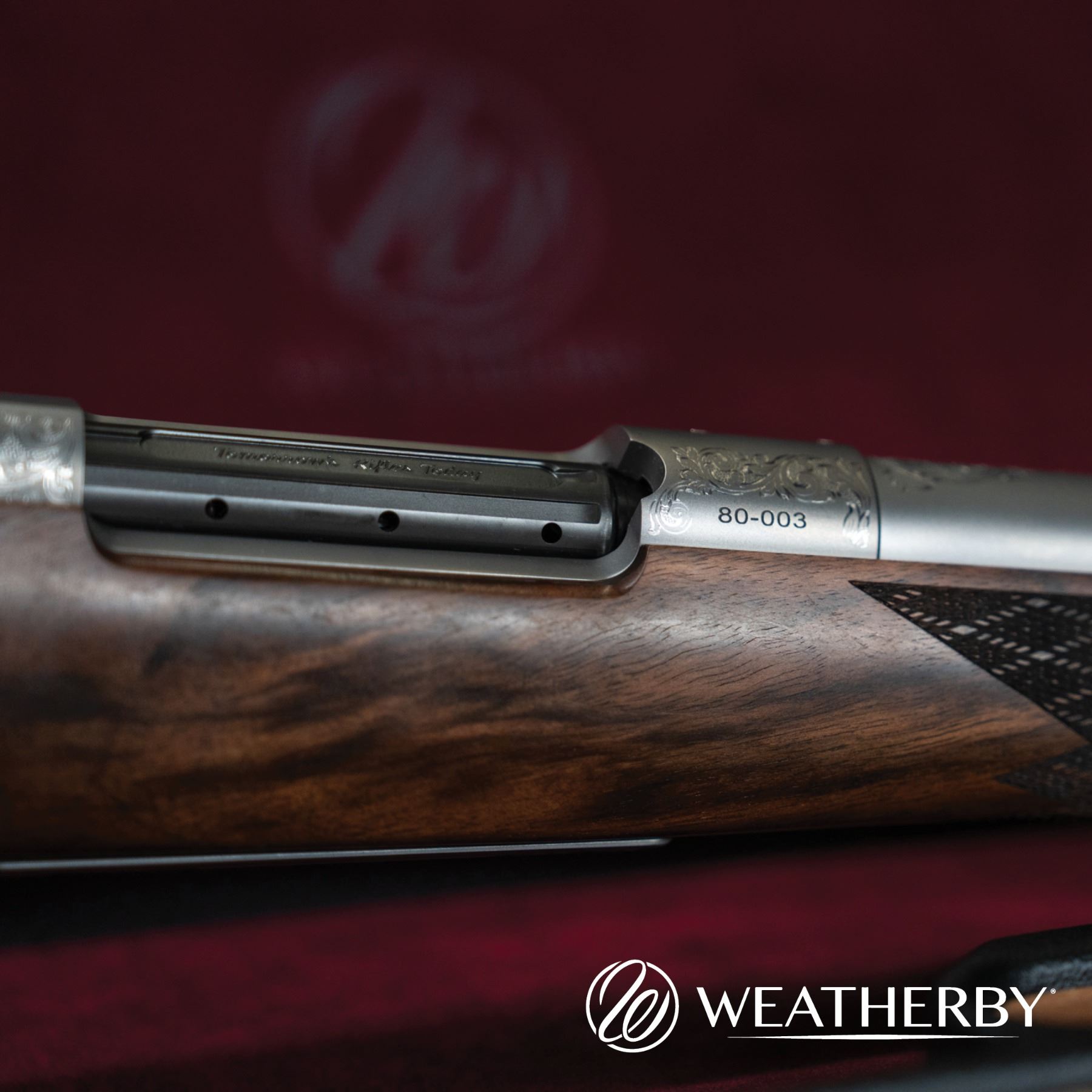 Crafted for Weatherby’s 80th Anniversary SN#80-003 and the first released to the public, this limited-edition Mark V blends tradition and innovation with an engraved titanium action, carbon fiber barrel, and exhibition-grade walnut stock.