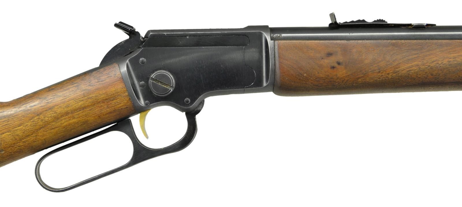 RIFLE. Cal. 22 S, L, LR. S# AB24474 (1966). Bbl. 20" w/ Micro-groove rifling & oval "JM" stamp. Bead front & elevator rear sights. Tubular mag. Blued finish w/ gold finished trigger. Hammer has JM marked extension. Slim forearm & straight grip walnut stock w/ buttplate & sling swivel. CONDITION: very good w/ scattered areas of peppery oxidation & scratches on receiver. Very good wood finish w/ missing Marlin trademark on toeline, large scuffs & handling marks. Forearm tip shows sanding marks. Near excellent bore. (23-782/MD). CURIO. $750-1,000.