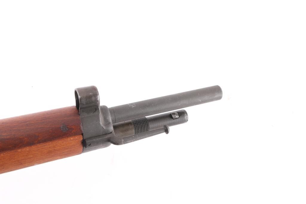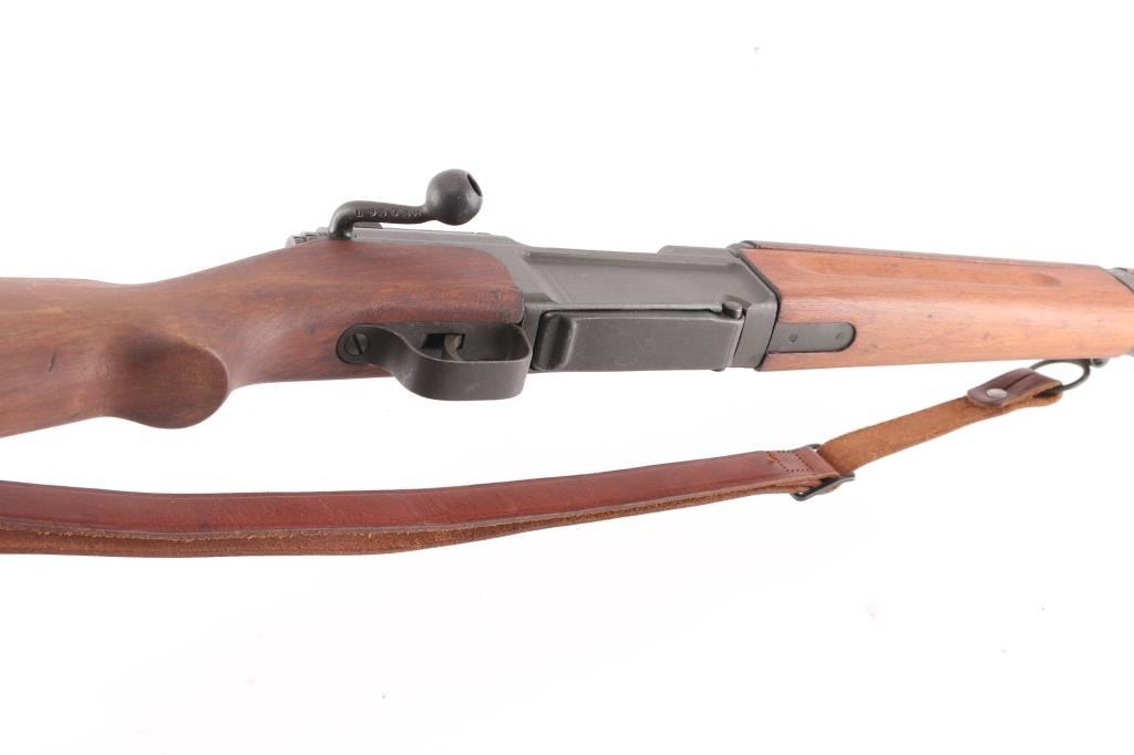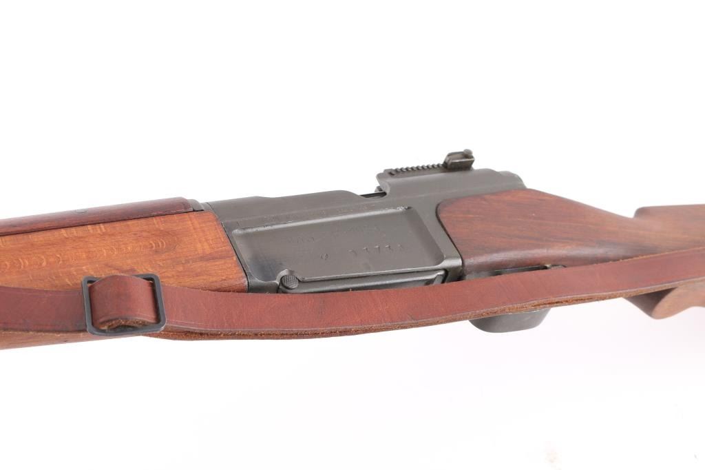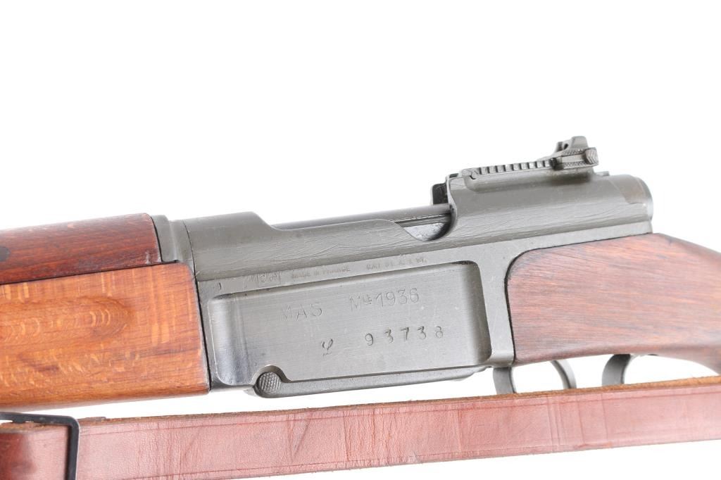 French military semi-automatic service rifle chambered in 7.5x54mm, manufactured circa 1937-1952. Imported by CAI Vermont, very feint markings on left receiver. Features: parkerized finish, 22.5" barrel, spike bayonet, stacking hook, hooded blade front sight, receiver mounted peep rear sight with tangent elevation slide, dog leg bolt, smooth wood handguard & forend, and pistol grip shoulder stock. Bore appears very good, bright, strong rifling, Parkerized finish is excellent, wood is excellent, action is smooth. Correct brown leather sling attached. Black issue slip-on recoil pad, marked “MAS 1951”. This rifle was featured in the Sep 2020 issue of Guns Magazine in the “Surplus & Tactical” article “The MAS 36” by Payton Miller. Issue included.NRA Condition-Excellent. C&R Firearm.