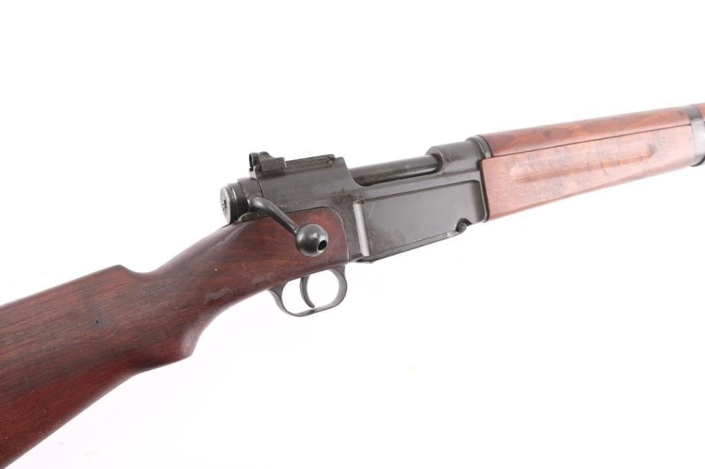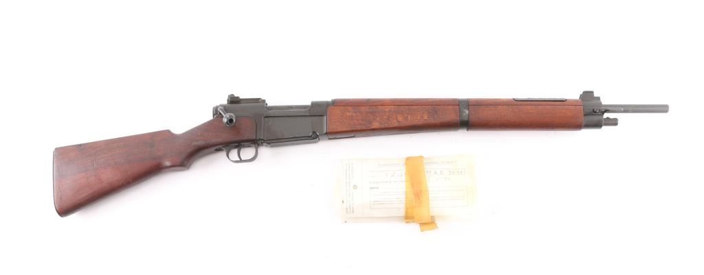 French military bolt action service rifle chambered in 7.5x54mm, circa 1948-1951. Imported by C.A.I. of St. Albans, Vermont with import marks on receiver. Features a parkerized finish, 25" barrel with grenade launcher sights, winged blade front sight, graduated rear aperture peep sight to 1,200 meters, spike bayonet in forearm, integral box magazine with mismatched serial number, angled bolt handle, sling swivels, smooth wood handguard and pistol grip shoulder stock with metal buttplate. Rifle shows an even dark grey finish throughout baring only a few light scuffs. Action is strong, bore is very good, needs cleaning are wood stocks are fine. A document in French with matching serial number, dated 8-5-72 is attached to the butt stock.