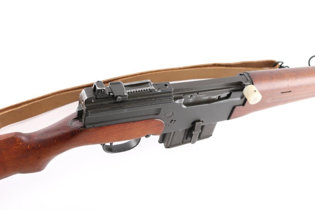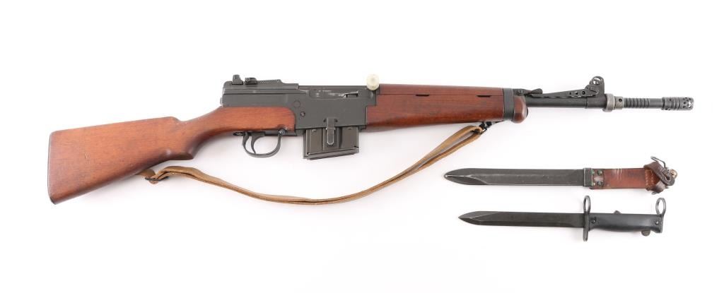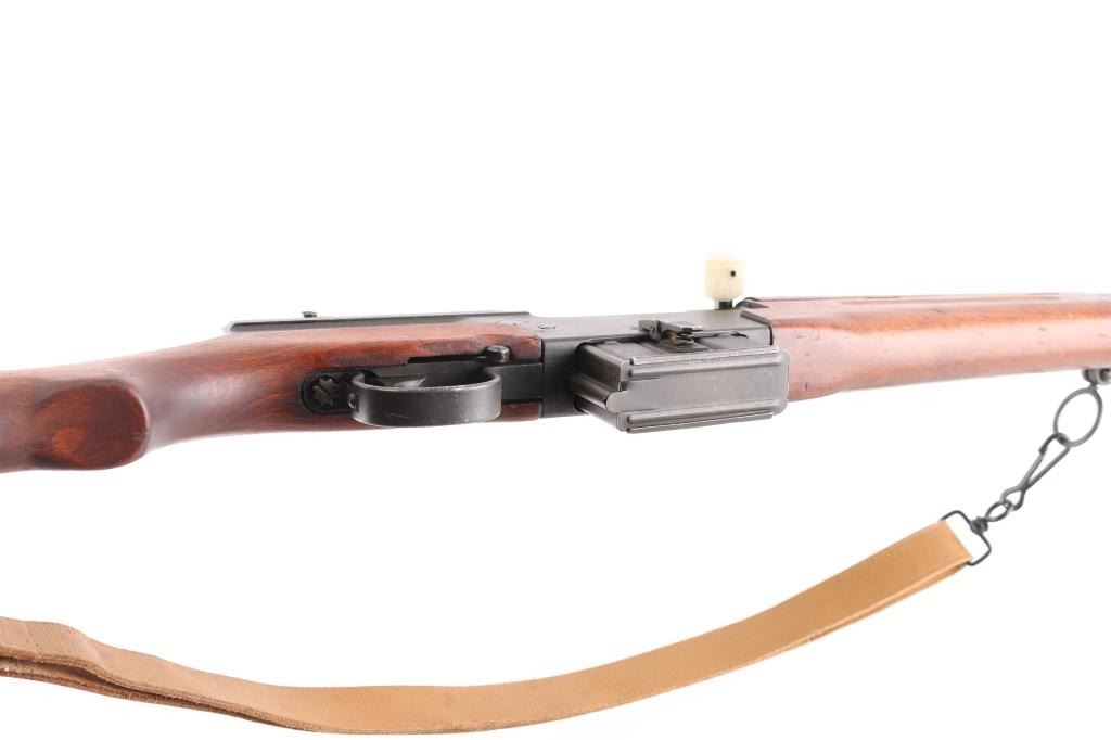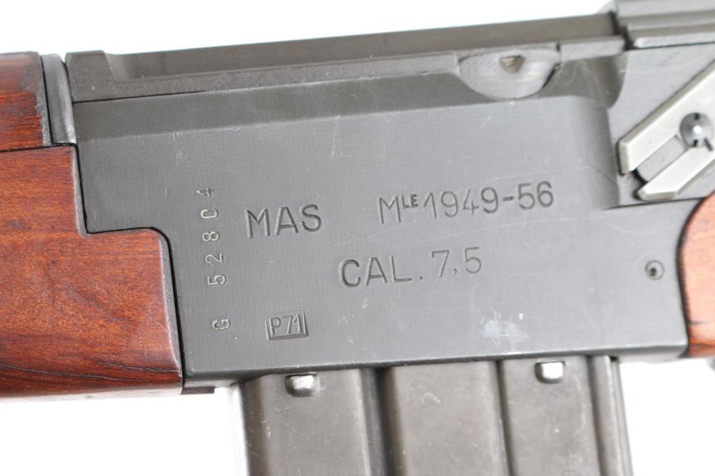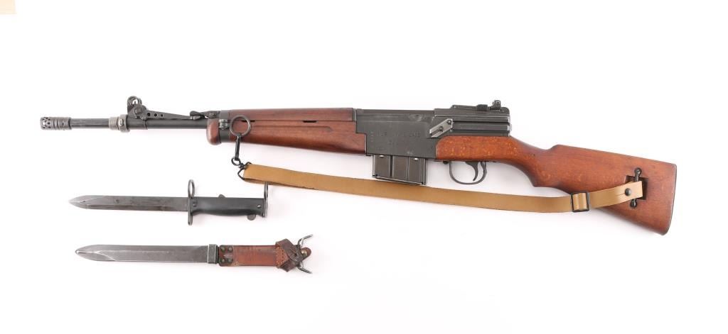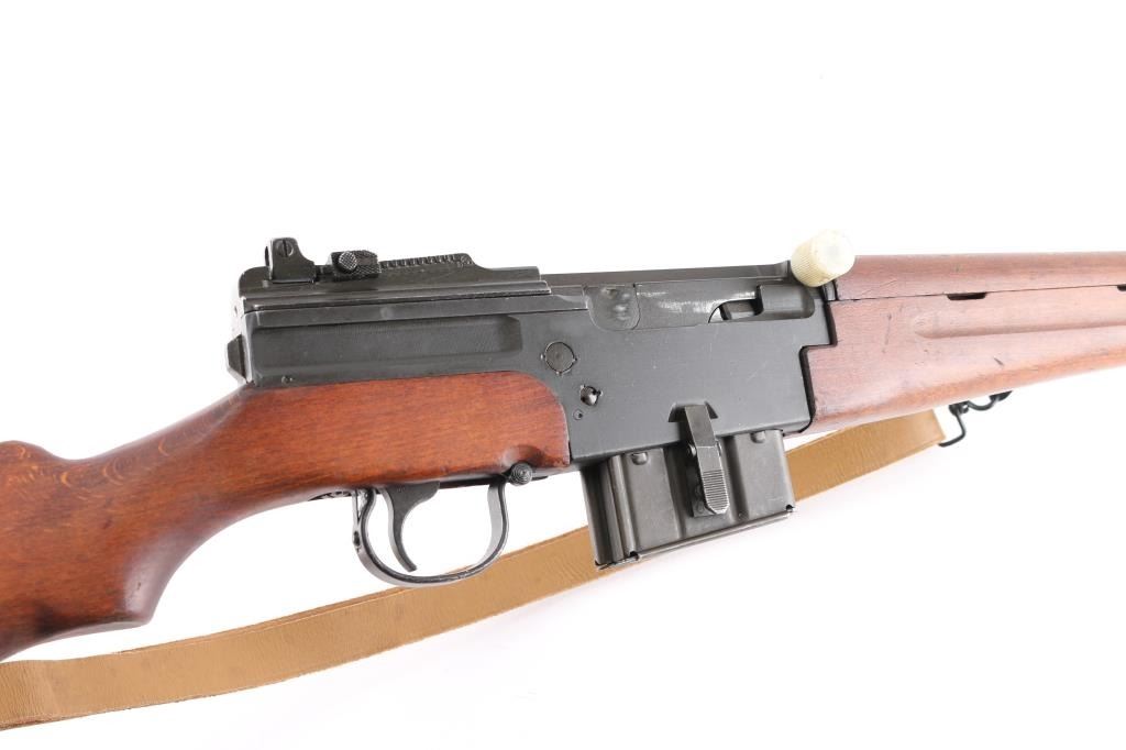 French military semiautomatic rifle chambered for 7.5mm French. Features approx 18 inch barrel, ported muzzle brake attached, adjustable sights, integral grenade launcher with gas cut-off and flip up grenade sight, side mounted sling swivels, White plastic charging handle. Correct tan leather sling and bayonet w/ scabbard attached, both in very good condition. Bore is good, strong rifling, light frosting in the grooves. Parkerized metal finish is very good with minor scratches and handling wear. Wood is very good condition with a few very minor scratches/dings. One 10 rd magazine. Feint CIA import marks on left receiver.
