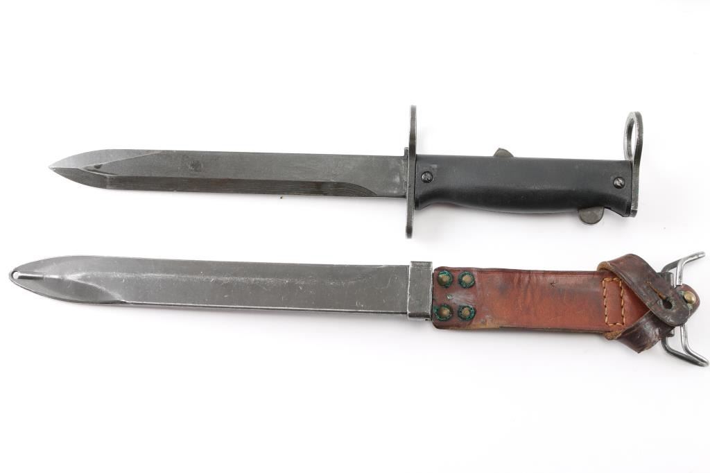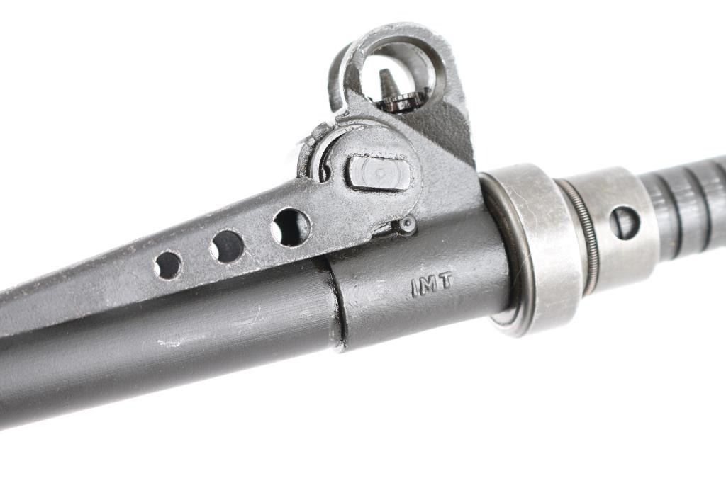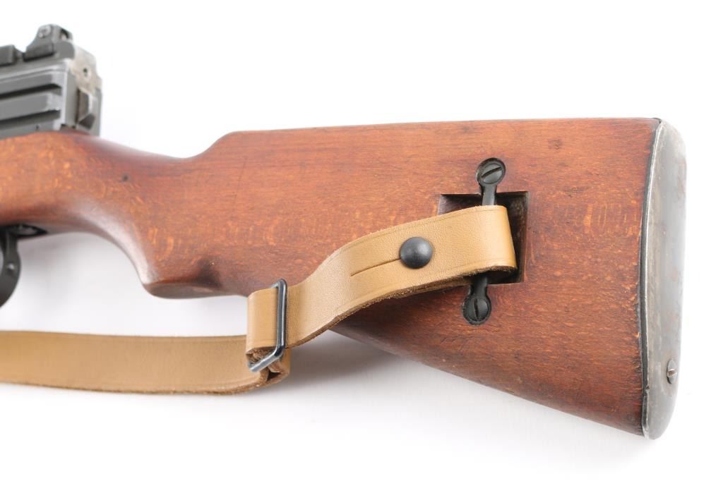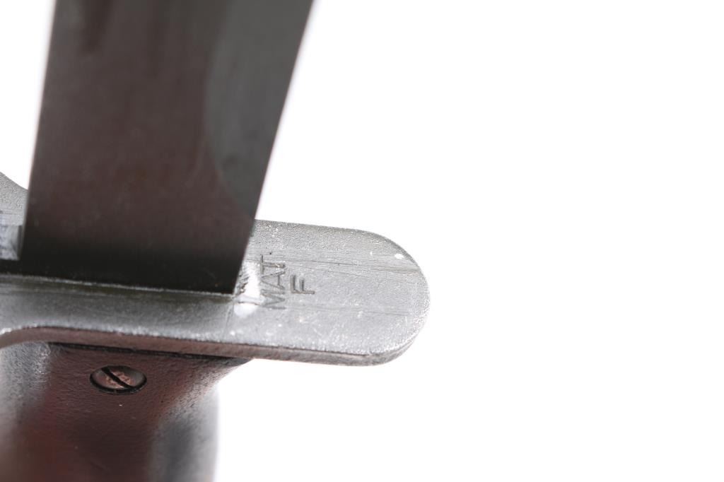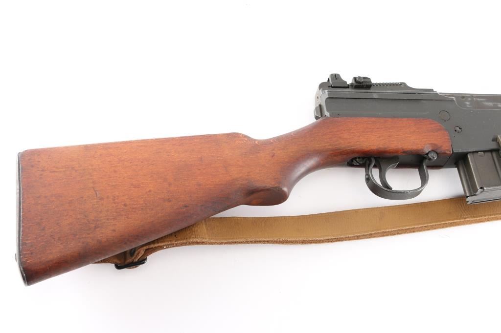 French military semiautomatic rifle chambered for 7.5mm French. Features approx 18 inch barrel, ported muzzle brake attached, adjustable sights, integral grenade launcher with gas cut-off and flip up grenade sight, side mounted sling swivels, White plastic charging handle. Correct tan leather sling and bayonet w/ scabbard attached, both in very good condition. Bore is good, strong rifling, light frosting in the grooves. Parkerized metal finish is very good with minor scratches and handling wear. Wood is very good condition with a few very minor scratches/dings. One 10 rd magazine. Feint CIA import marks on left receiver.