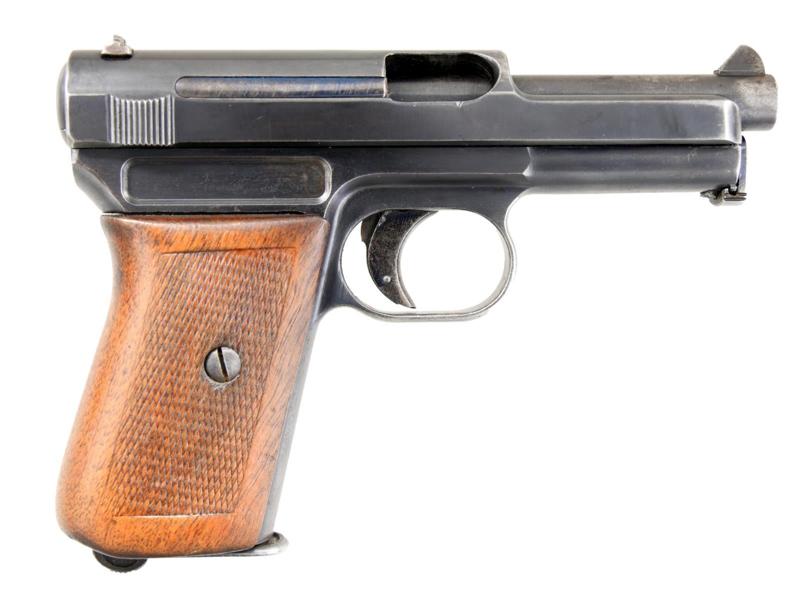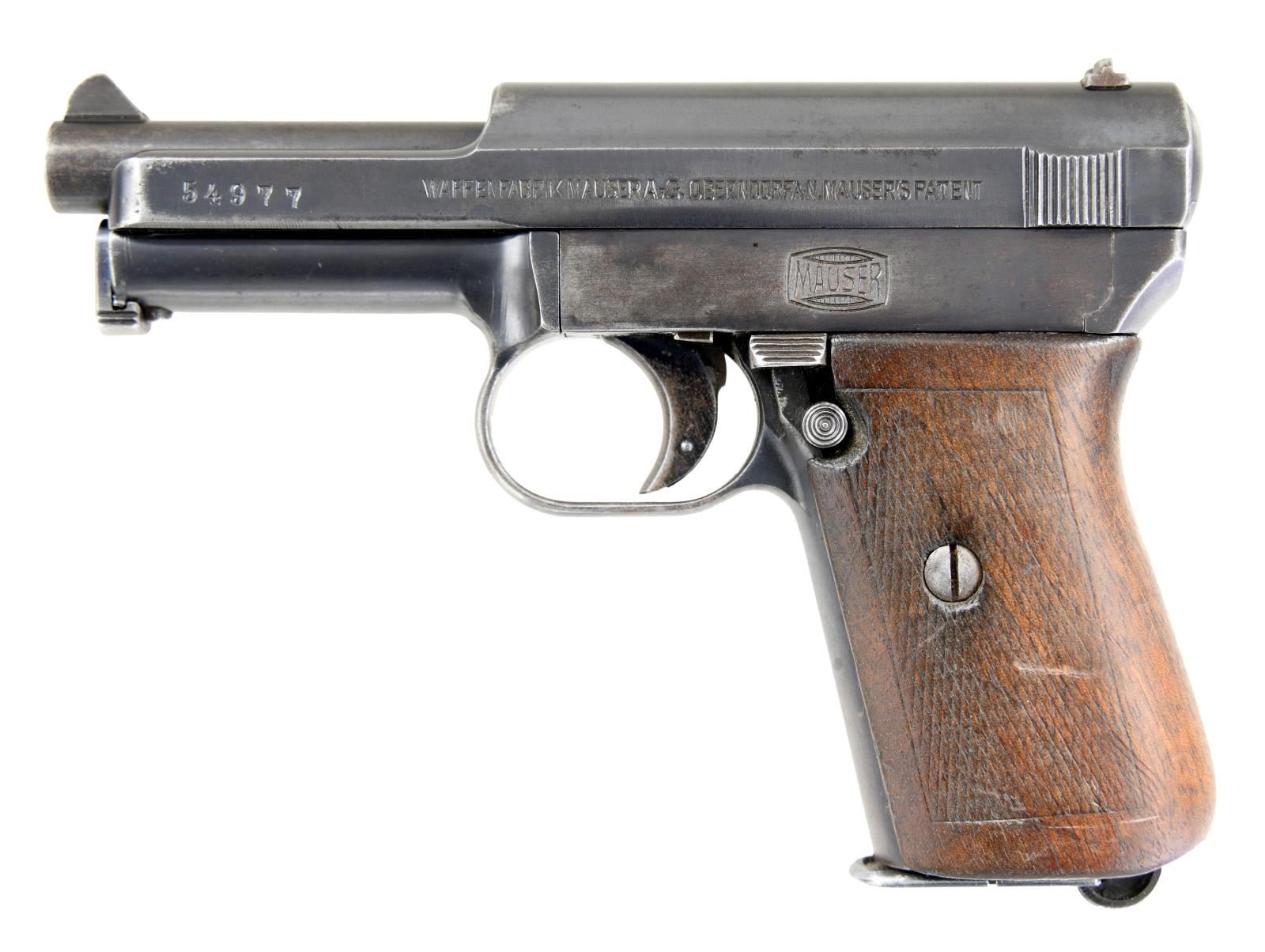 Cal. 32 ACP. S# 54977. Bbl. 3 3/8". Serrated ramp front & simple notch rear sights. All visible S#s match. Mauser banner left side frame. Blued finish w/ fire blue on trigger. One piece walnut checkered grips. MAGS: 1-8 rd. Mauser marked factory. CONDITION: metal retains about 80% original blue & some fine scattered pits & dings w/ strong fire blue on trigger. Grips retain visible checkering but are worn smooth. Bore is good, strongly rifled & reasonably bright w/ frosting & fine pitting. (23-902/CW). CURIO. $300-400.