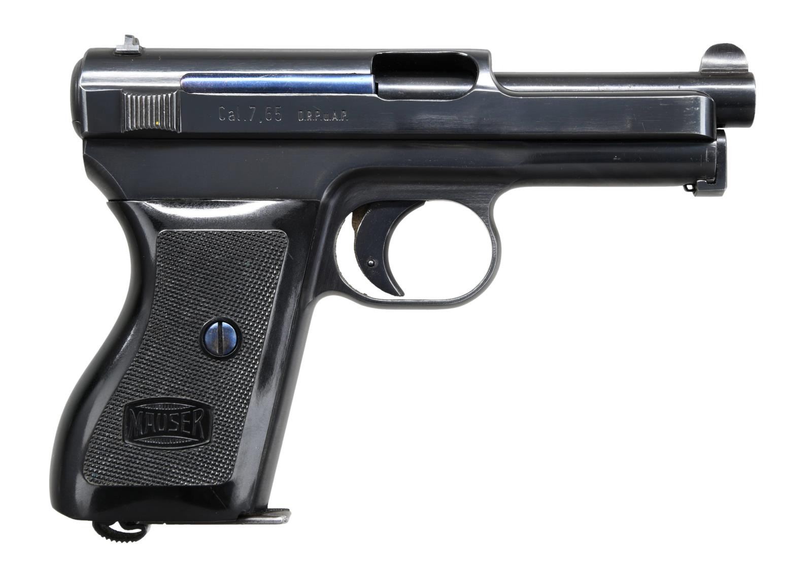 Cal. 7.65mm. S# 536278. Bbl. 3 1/4". Similar to earlier Model 1914, but w/ different grip profile. Fixed sights & matching visible serial numbers. “MAUSER” banner on left side frame & “DRPuAP” on right side frame. “MAUSER” marked black checkered grips. MAGS: 2-8 rd. factory, 1 w/ Mauser banner on base. UNATTACHED ACCESSORIES: German P27 brown leather flap holster w/ circled “CZ” logo, 1942 date & “WaA76” Waffenampt markings on back. CONDITION: metal retains most of an excellent quality refinish; markings are slightly washed in appearance. Grips show fine scratches & minor chipping. Bore is very good plus, bright & strongly rifled. (23-376/CW). CURIO. $400-600.
