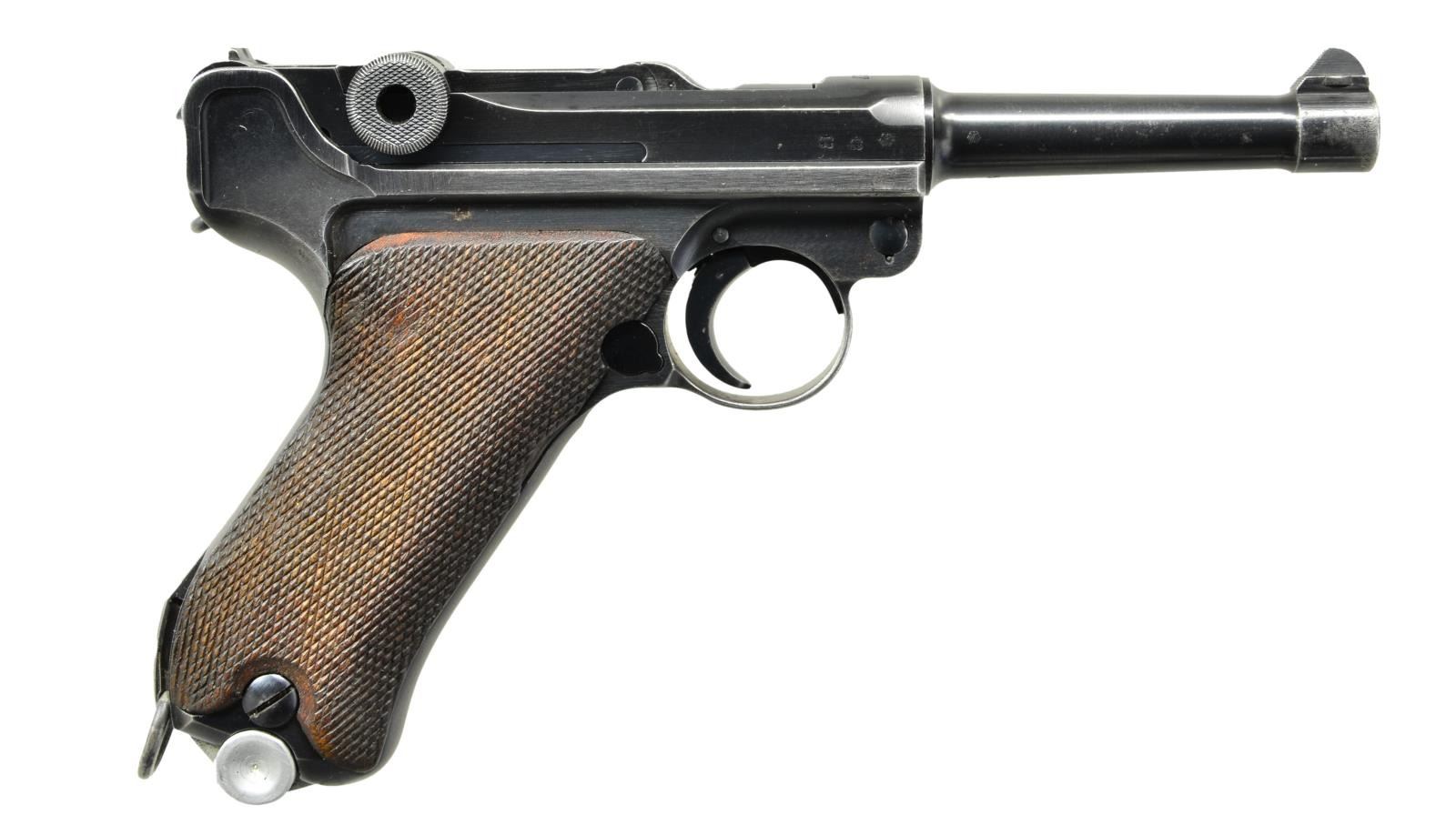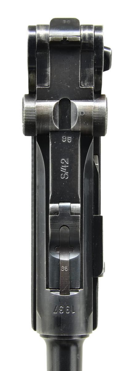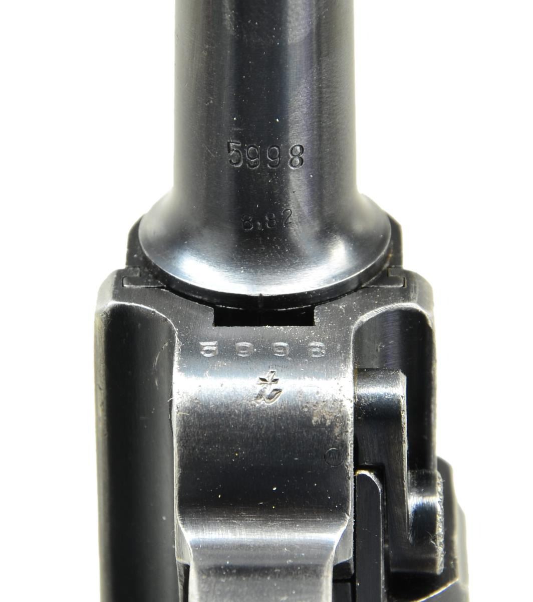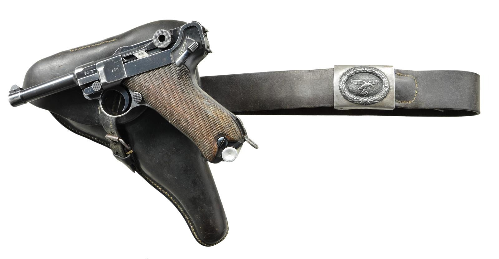 Cal. 9mm Luger. S# 5998t. Bbl. 4" w/ fin shaped sight, full S# plus eagle 63 & eagle test fire proofs. Mfg. 1937 w/ all blue late finish; blued interior too. Approx. 89,000 made S# 1501t-400b. Dual eagle 63 plus eagle test fire proofs on receiver. Bottom of stock lug cross drilled w/ robust lanyard ring added. All matching numbered including beech grips, sear & gas grooved firing pin; left grip additionally w/ "F". 1937 over chamber & "S/42" on toggles. MAGS: 2 good blued reproduction 8 rd.; aluminum base & follower plus wood base & plastic follower (both unmarked). UNATTACHED ACCESSORIES: good to very good holster & belt plus eagle party symbol marked very good loading tool. Holster is by Auwaerter & Bubeck w/ eagle WaA107 & 1936. Buckle & strap flap retention plus double belt loops; rear has 1 set of stitching detached near bottom. Very good belt dated 1938; difficult to read maker appears to be "MAX KOBESTEIR". Adjustment end of leather stamped "85". Unreadable marking of 2 words on inside near fixed end. Under folded flap at fixed end is carefully inked word of "Pagels" or "Pagets" (name?). Set for approx. 36" waist. CONDITION: good to very good overall having typical Luger high point & function wear. Markings plus profiles very sharp & clear w/ original finish. Grips w/ light marks plus flattened diamond top wear. Hold open latch missing spring plus rear toggle pivot is made of brass & should be replaced before using; no alterations to receiver for brass pivot. Good bore w/ wear & frosting. (23-514/NW). CURIO. $1,000-1,500.