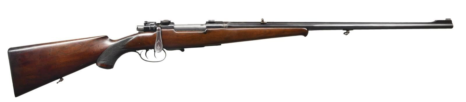 Cal. 8x60. S# 1344. Bbl. 25", half round/half octagon. Classic looking rifle w/ full length matted rib holding a fixed ramp style front & two leaf (one folding/one fixed) rear sight along with integral claw mounts atop receiver for mounting a scope. Rifle has light engraving mostly scroll w/ circles on either side of the frame & atop the bridge. Butterknife bolt handle S# "44" & double set triggers w/ lever on floorplate to dump internal magazine. Half stock has semi Schnabel tip, smooth forend, checkered pistol grip w/ ebony cap, raised cheek rest & single sling swivel on toeline. Bottom of bbl. has another swivel. CONDITION: metal retains about 80% fading blue w/ some freckling. Stock is chipped along left stock line & the fit to the trigger guard is poor at the forward screw. Balance has moderate scattered dings & dents. Bore is good plus w/ strong rifling & is fairly bright. (23-2174/CW). CURIO. $600-800.