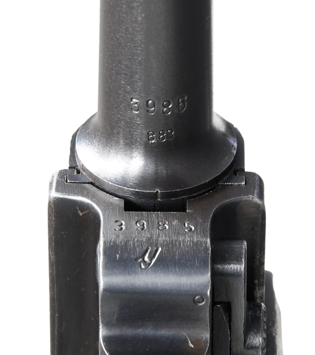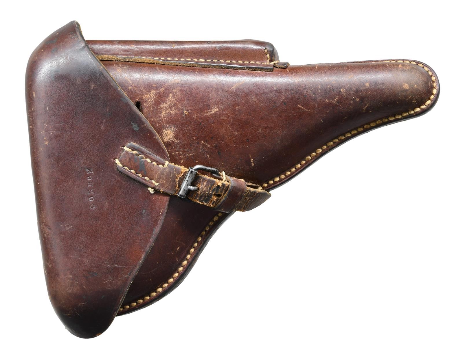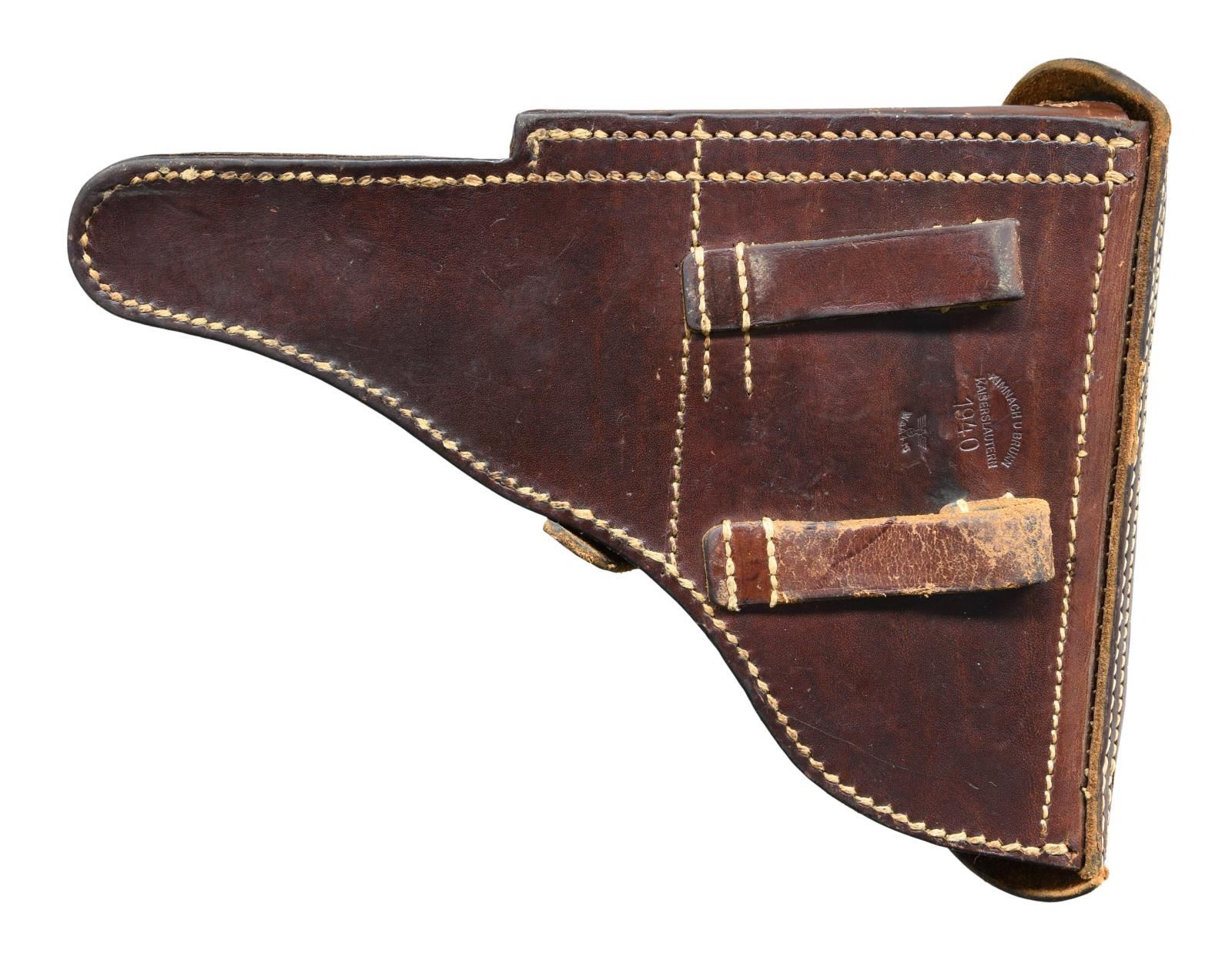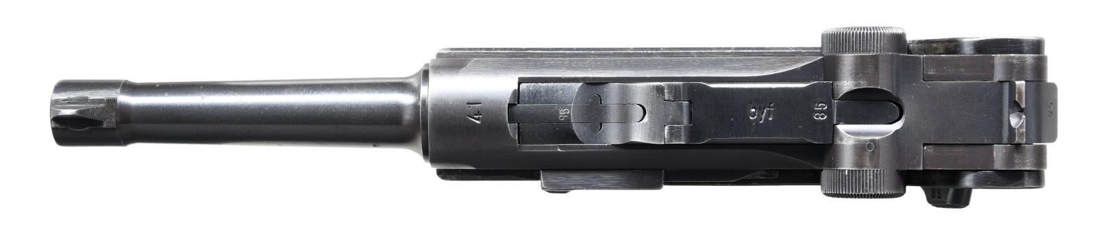 with HOLSTER. Cal. 9mm Luger. S# 3985y. Bbl. matching numbered 4" with serrated faced fin shaped sight; notched toggle at rear. Mfg. 1941 (126,000 units; S# 3300n-1000) with early marks and matching numbers on all metal parts to include rear toggle pivot; checkered walnut grips with large "29" on back of each. "P.08" on left flat of receiver plus 2 eagle 655 proofs and eagle party proof on receiver. "byf" on toggle and "41" over chamber. Correct salt blued finish throughout with no strawed parts nor in the white of interior. Differs from Black Widow model only by having wood grips rather than black plastic. MAGS: 2 very good extruded 8 rd. with aluminum bases, TOTAL; 1 with base numbered "9804 / 2" and "2/1001" on body plus 1 with base having number removed plus body marked "fxo", "P.08", and with 2 eagle 37 proofs. UNATTACHED ACCESSORIES: very good brown flap holster having buckle and strap retention. Back marked "KIMNACH U BRUNN", "KAISERSLAUTERN", "1940" and eagle party symbol over "WaA416"; front of flap neatly stamped "GORDON". Rear belt loop is well done replacement plus end of lift strap missing. Light scuffs on lower front of holster, cracking on retention strap and aged appearance to replacement belt loop; balance in very nice original condition. Front of good loading tool with eagle proof plus "G.G.G.K." on back. CONDITION: most noticeable are its exceptionally clear markings and sharp profiles that appears to be original finish; breech face indicates very minimal use. Well fitting grips with light hand wear being lightly proud at backstrap. Typical high point and holster wear with minimal thinning in grip area; occasion spots of very light cleaned pitting. Very good bore with light wear and hint of cleaned frosting. Very good example overall. (23-933/NW). CURIO. $1,250-1,750.