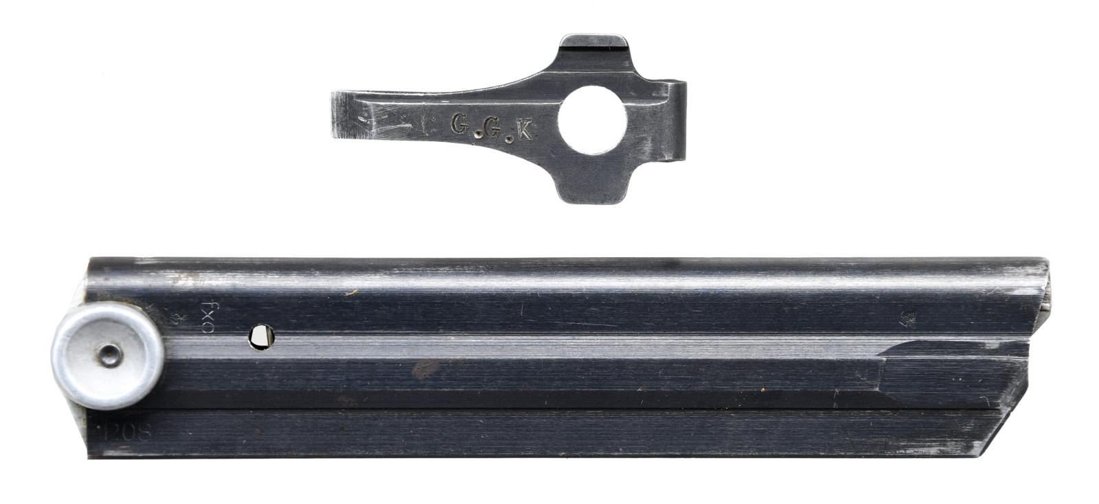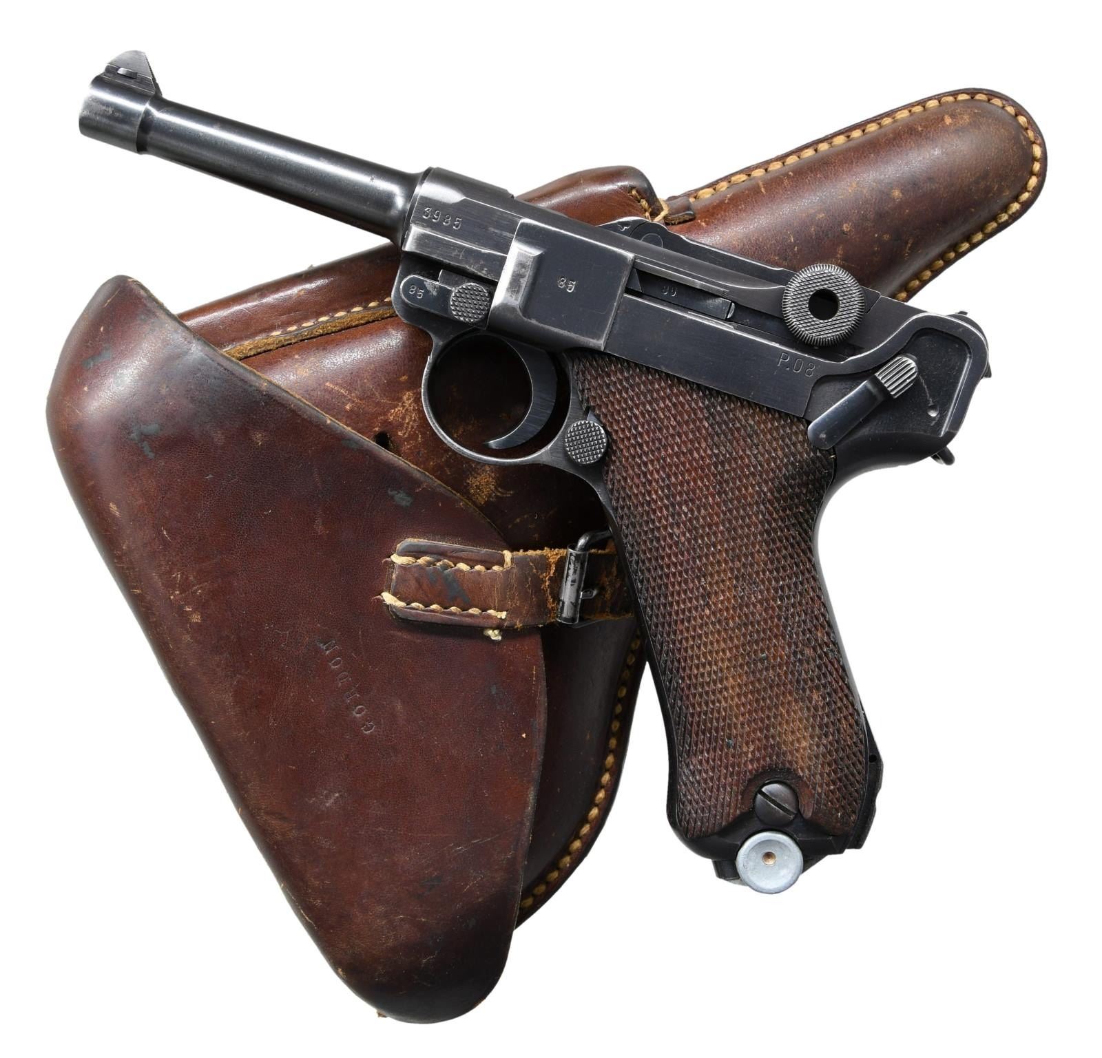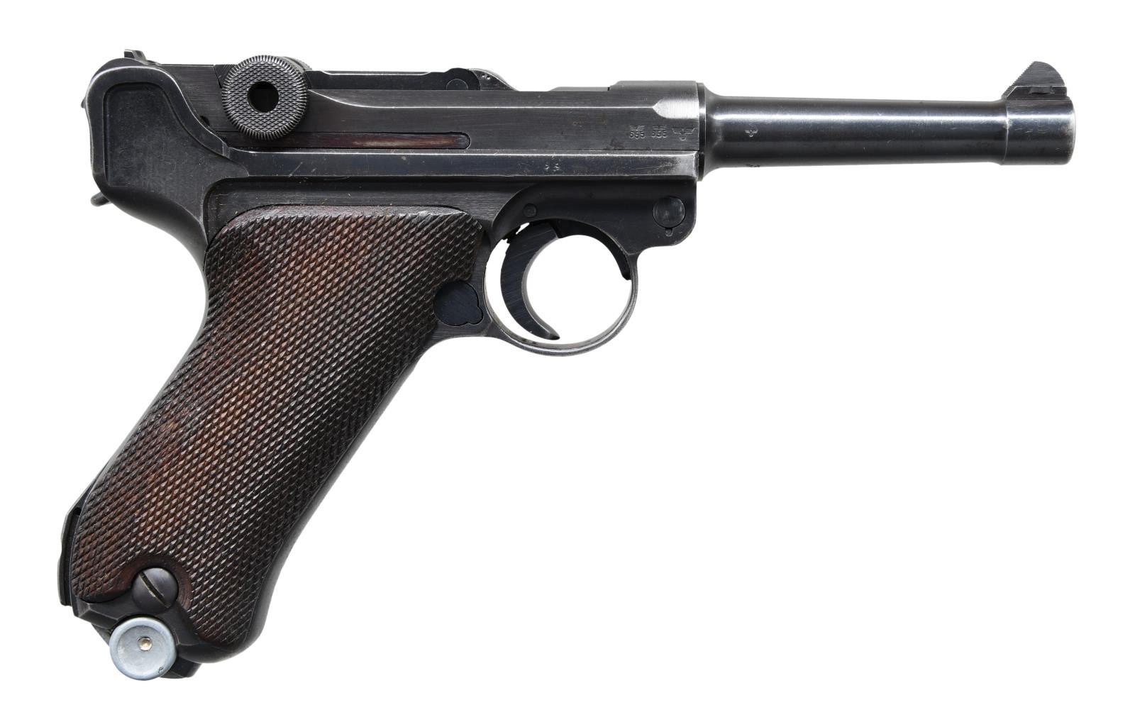 with HOLSTER. Cal. 9mm Luger. S# 3985y. Bbl. matching numbered 4" with serrated faced fin shaped sight; notched toggle at rear. Mfg. 1941 (126,000 units; S# 3300n-1000) with early marks and matching numbers on all metal parts to include rear toggle pivot; checkered walnut grips with large "29" on back of each. "P.08" on left flat of receiver plus 2 eagle 655 proofs and eagle party proof on receiver. "byf" on toggle and "41" over chamber. Correct salt blued finish throughout with no strawed parts nor in the white of interior. Differs from Black Widow model only by having wood grips rather than black plastic. MAGS: 2 very good extruded 8 rd. with aluminum bases, TOTAL; 1 with base numbered "9804 / 2" and "2/1001" on body plus 1 with base having number removed plus body marked "fxo", "P.08", and with 2 eagle 37 proofs. UNATTACHED ACCESSORIES: very good brown flap holster having buckle and strap retention. Back marked "KIMNACH U BRUNN", "KAISERSLAUTERN", "1940" and eagle party symbol over "WaA416"; front of flap neatly stamped "GORDON". Rear belt loop is well done replacement plus end of lift strap missing. Light scuffs on lower front of holster, cracking on retention strap and aged appearance to replacement belt loop; balance in very nice original condition. Front of good loading tool with eagle proof plus "G.G.G.K." on back. CONDITION: most noticeable are its exceptionally clear markings and sharp profiles that appears to be original finish; breech face indicates very minimal use. Well fitting grips with light hand wear being lightly proud at backstrap. Typical high point and holster wear with minimal thinning in grip area; occasion spots of very light cleaned pitting. Very good bore with light wear and hint of cleaned frosting. Very good example overall. (23-933/NW). CURIO. $1,250-1,750.