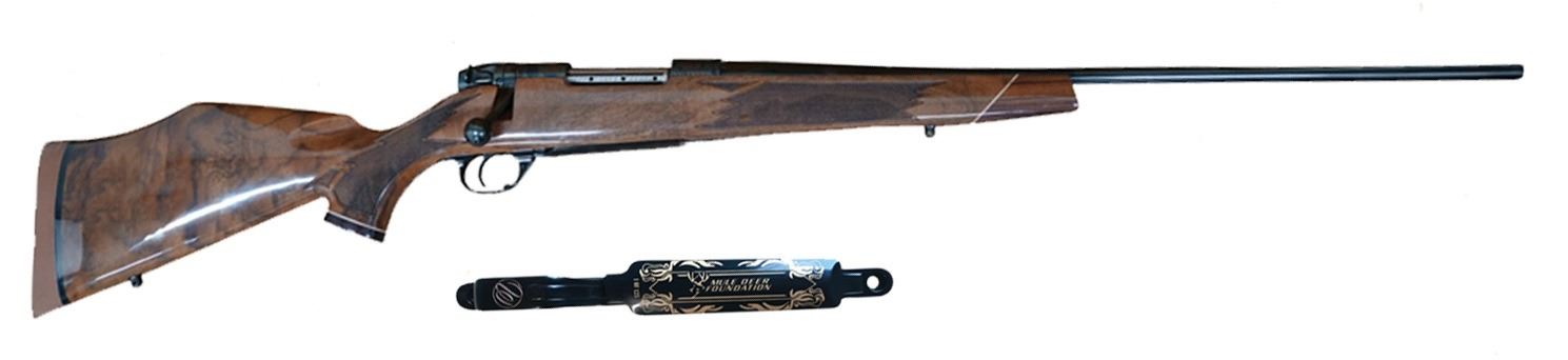 Mule Deer Foundation Gun of the Year presented by Weatherby. This limited edition, numbered rifle is a Weatherby Mark V Deluxe, chambered in the popular .257 Weatherby, set in a AA Fancy Grade walnut stock, with MDF logo engraved and high gloss barrel and bolt. A beautiful edition to your collection and hand down to future generations.