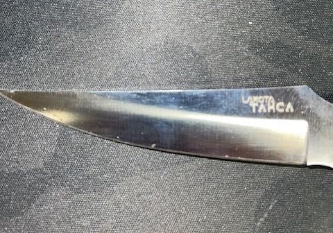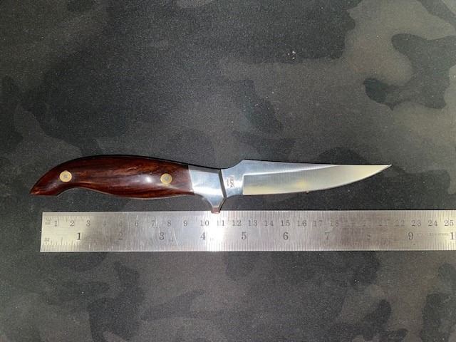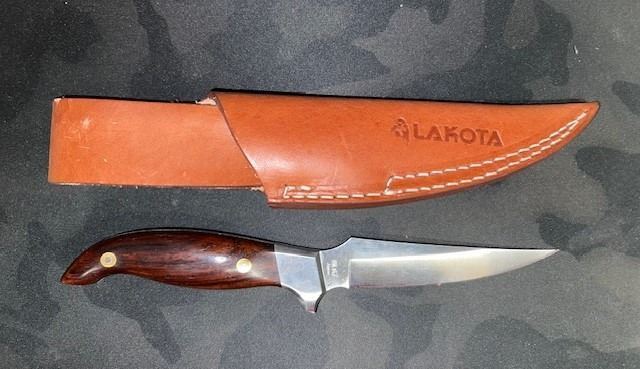 This Tahca by Lakota was produced by Moki. It features a satin finished blade with .119" blade stock and .872" blade depth, full tang construction. The handle has stainless steel bolsters, rosewood scales. Comes with a brown leather sheath.