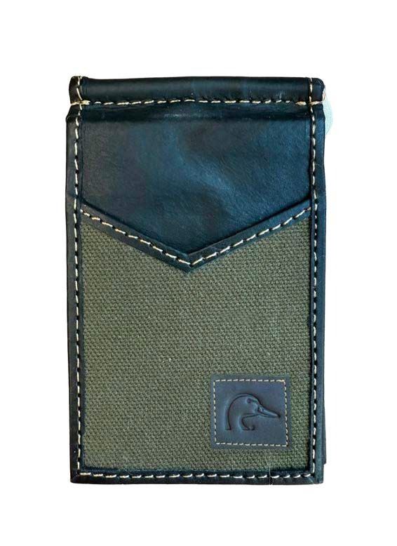 Slim front pocket card and cash wallet. Olive green with leather patch and trim. Two exterior pockets with interior metal money clip. Measures 3" x 4.25".