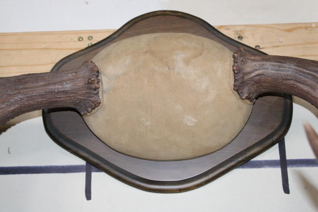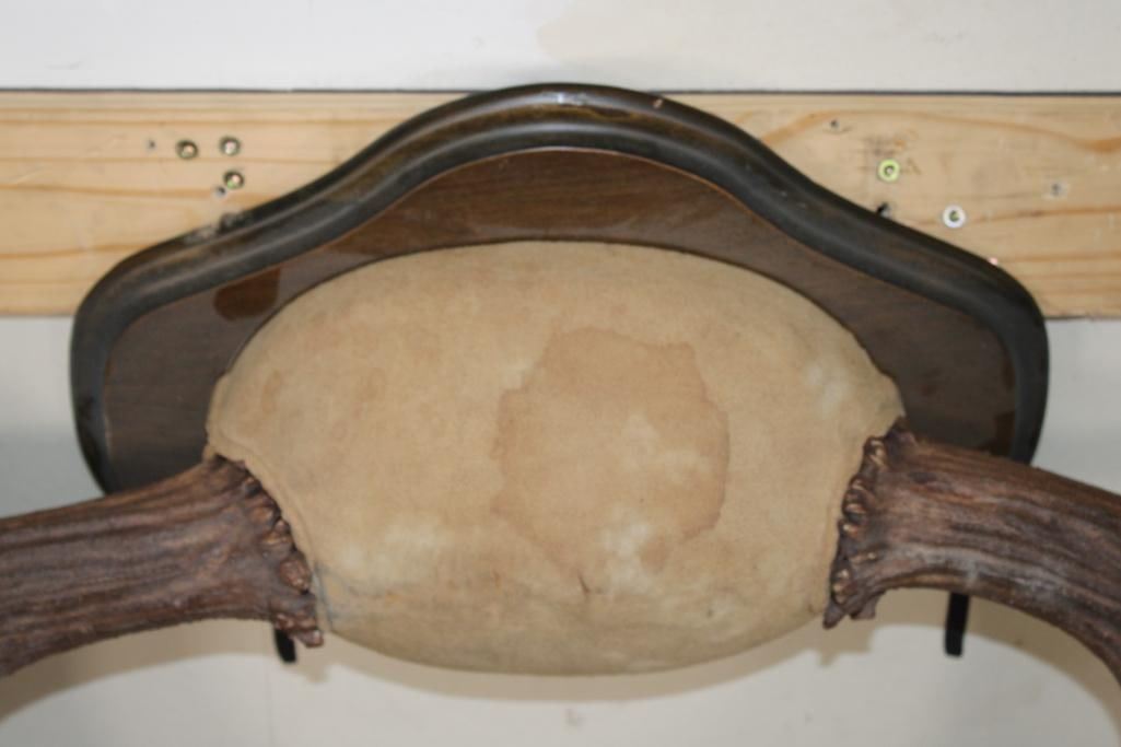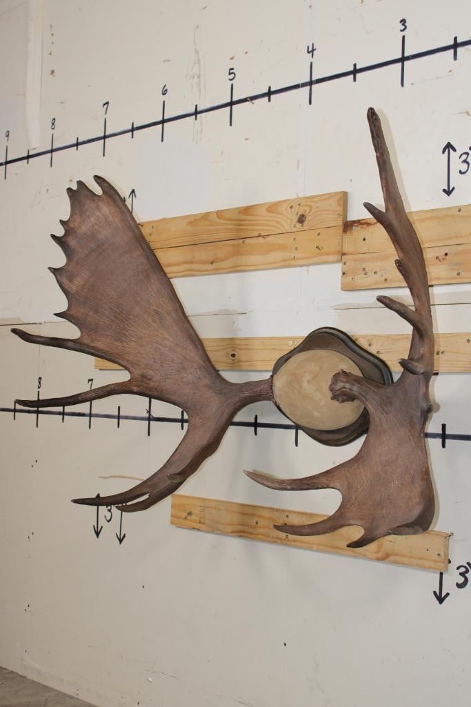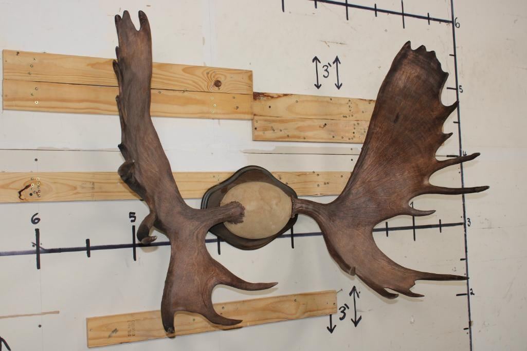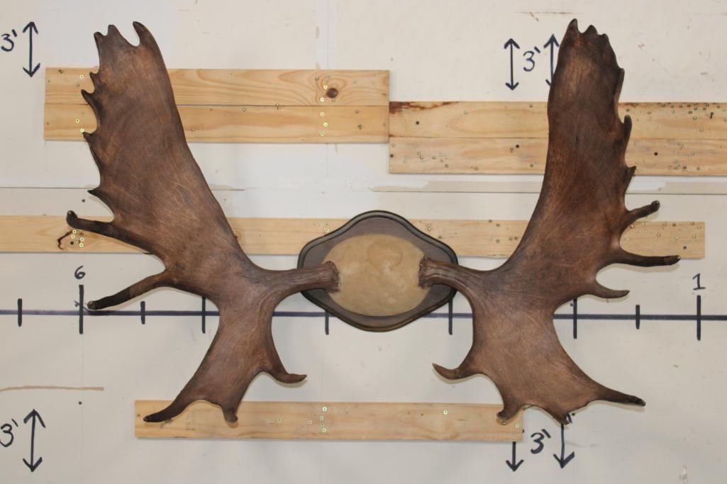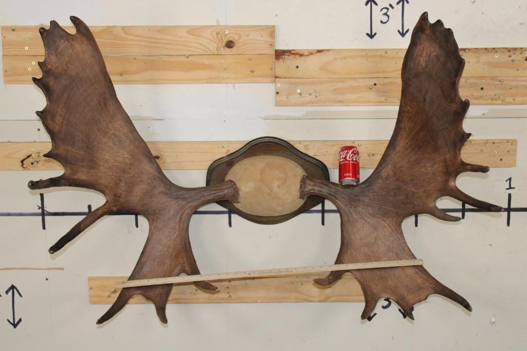 Respectable MOOSE Antler Rack Mounted on a Wooden Plaque with Suede. It was "Taken" 8-27-1967 in Alaska-Yukon and has a 48" Spread. The suede has a stain. TAXIDERMY