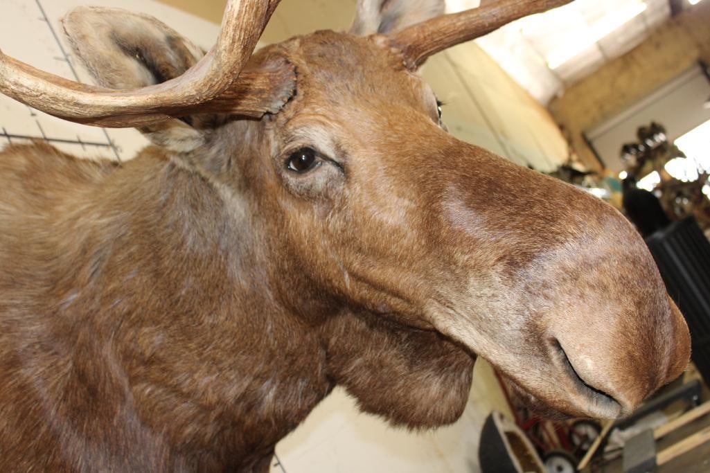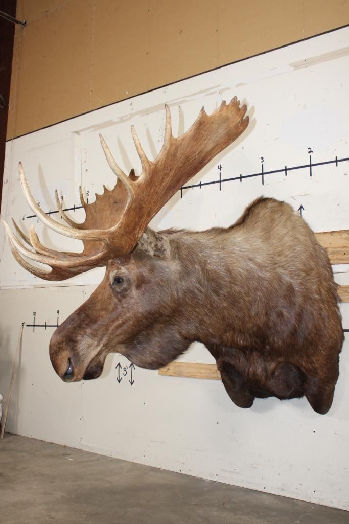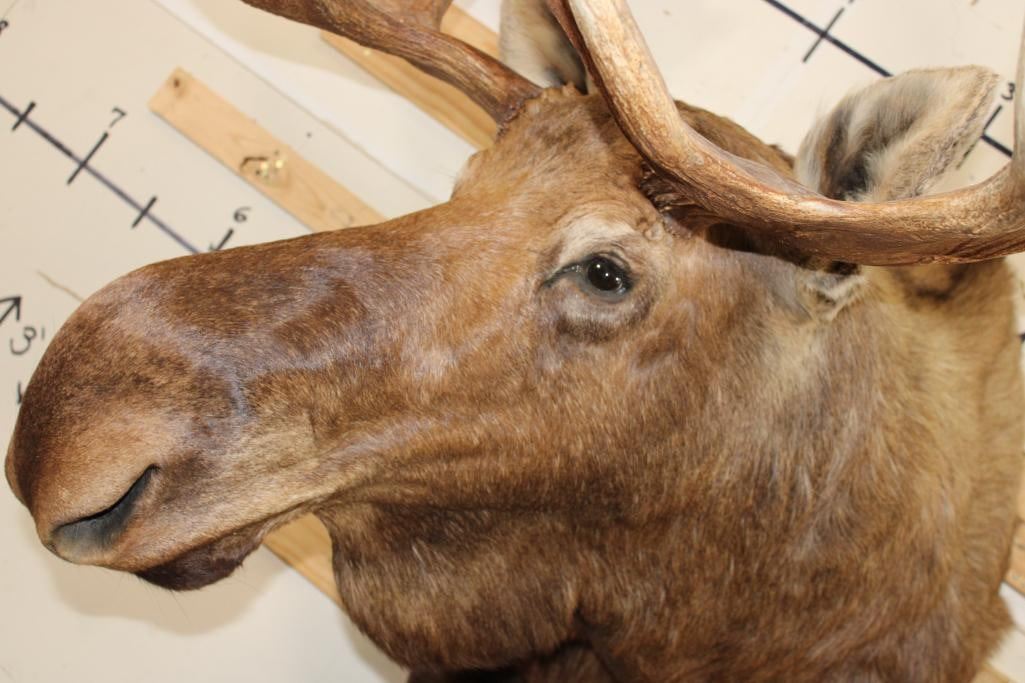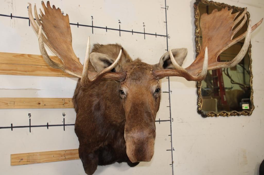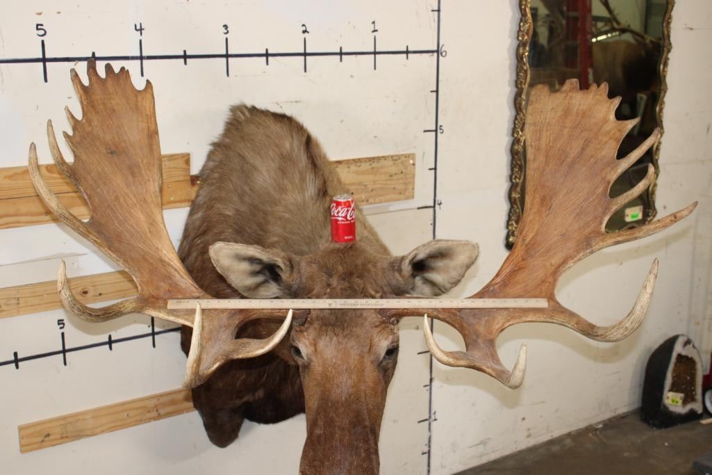 Very Nice and Clean MOOSE Shoulder Mount with a 58 1/8" Spread. It has a Bullet Hole through its Right Antler! The rack is removable and is in Very Good Condition. TAXIDERMY