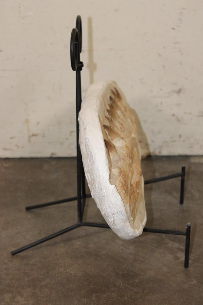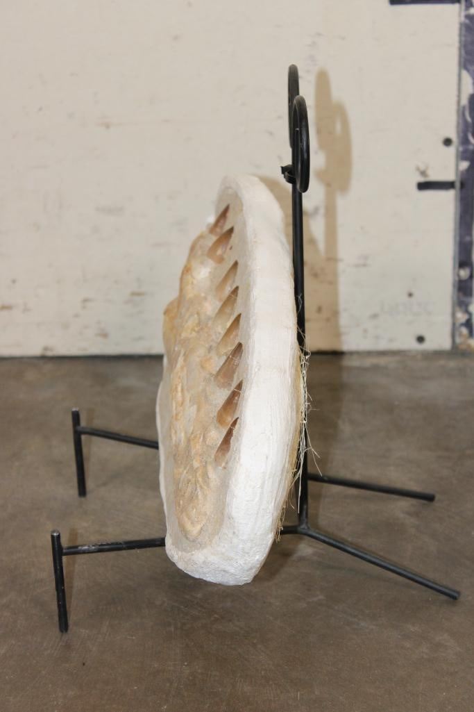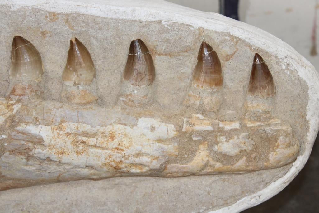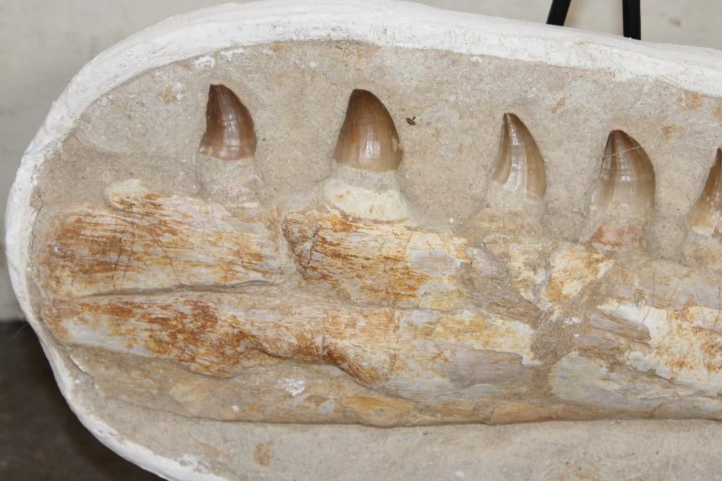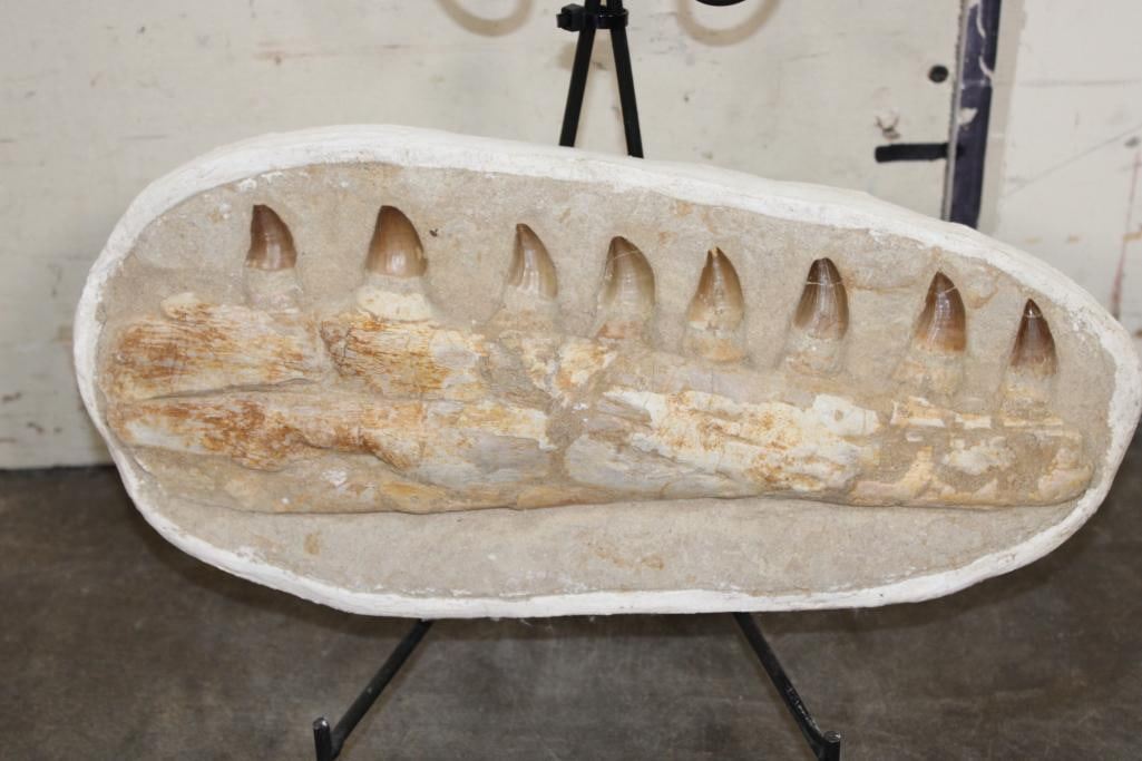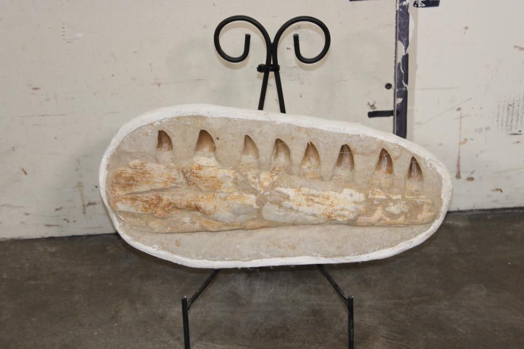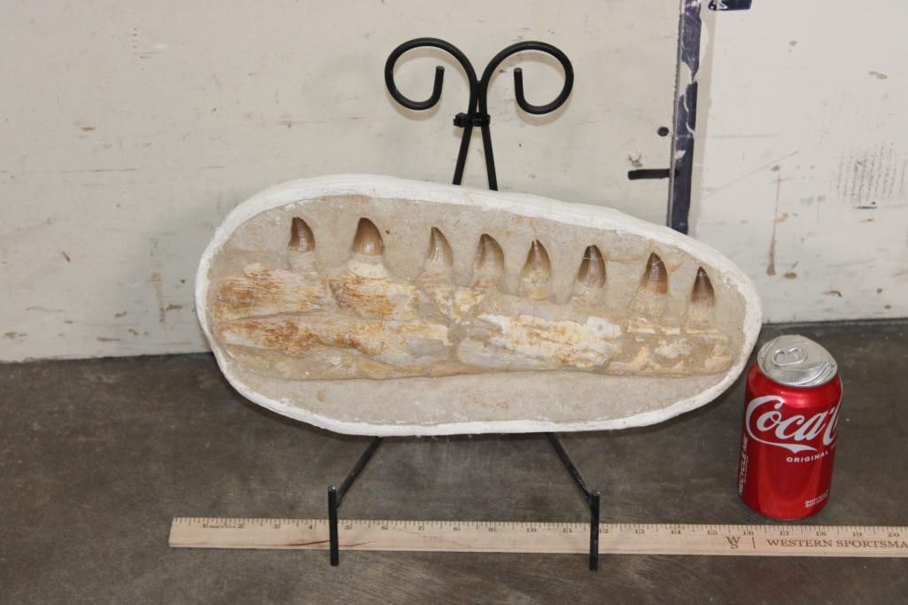 MOSASAURUS Jaw Fossil in a Matrix with 8 Big Teeth and a Metal Display Stand. The complete specimen measures 16" Long x 7.5" tall x 3" Thick. The Total Weight is 11 lbs. ROCKS MINERALS FOSSILS